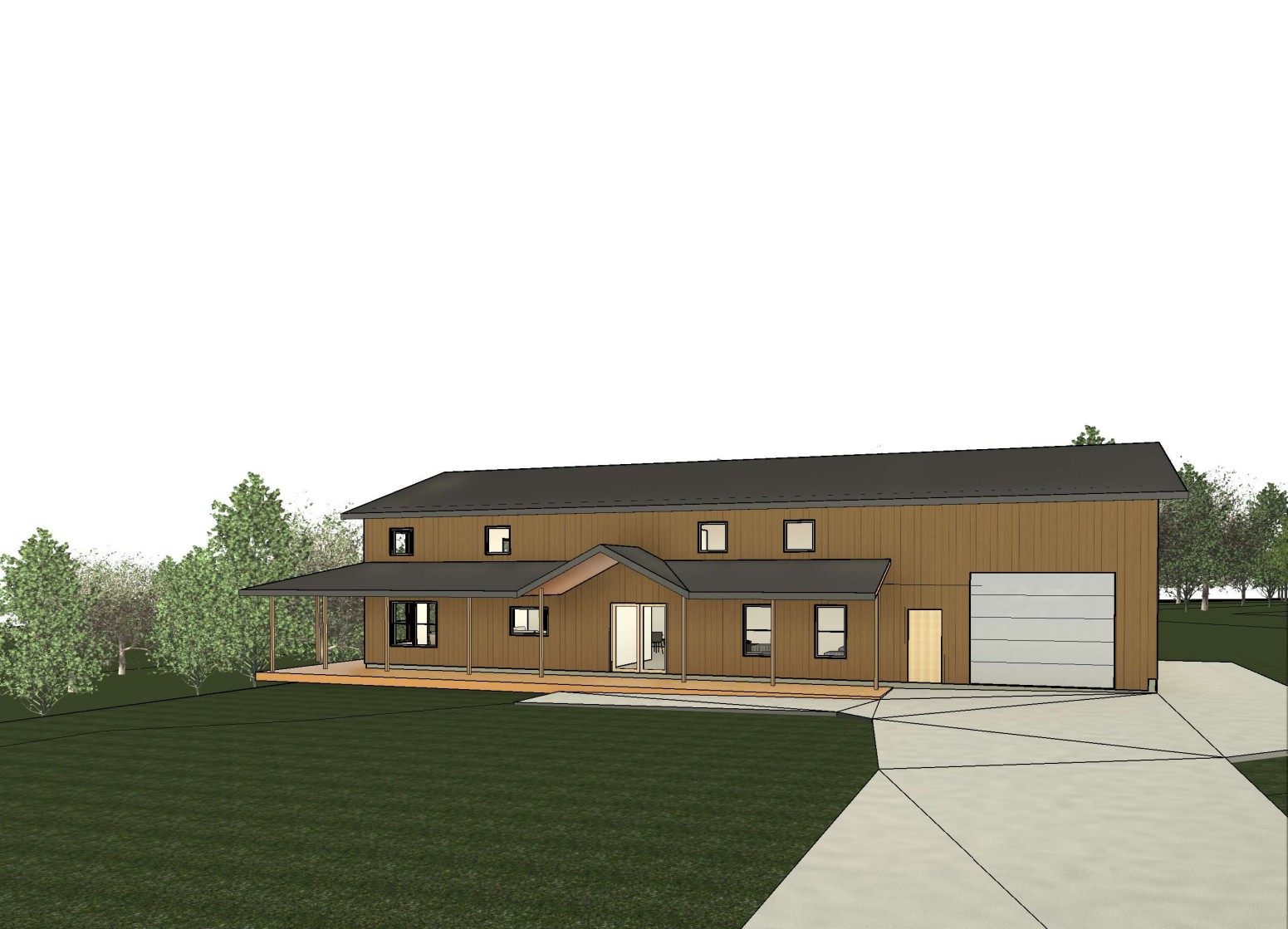 wood board and batten siding black metal roofing black windows facia and garage door stone driveway