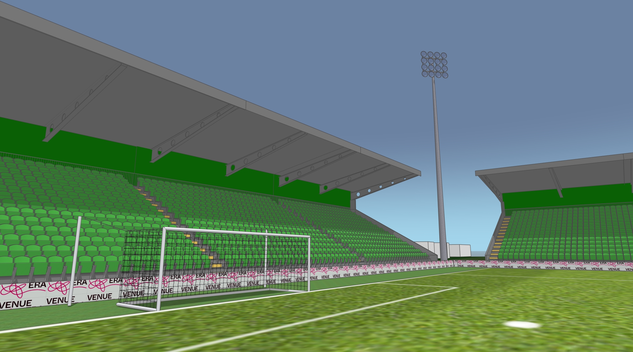 a serene football stadium in daylight featuring vivid green seats and lush grass the sky is a clear blue creating a peaceful atmosphere the roof structures are sleek and metallic gray light floods the scene enhancing the vibrant green and adding a sense of calm floodlights stand tall and majestic their metallic finish blending with the sky vibrant banners with a mix of red and white add contrast around the field border