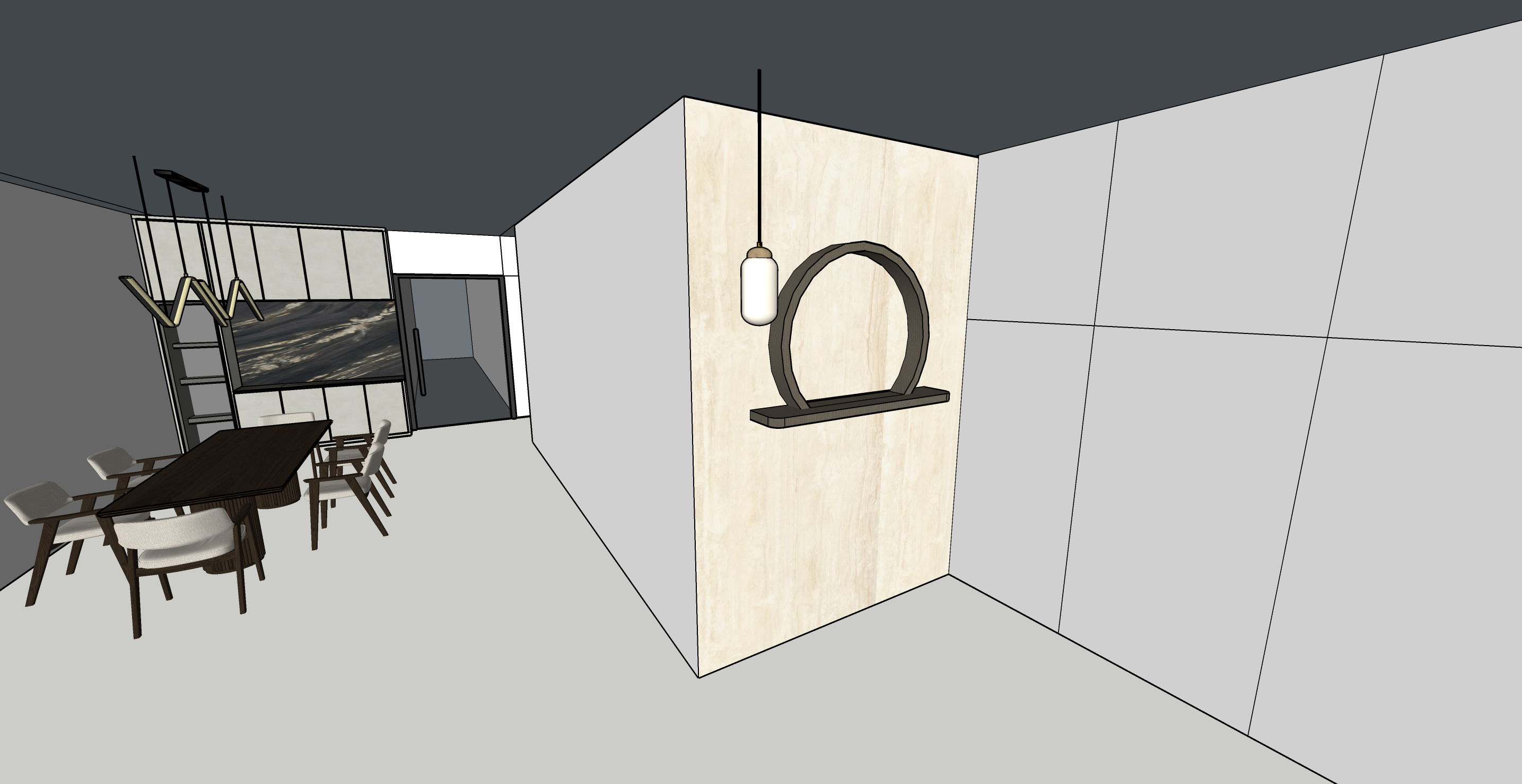 create a modern interior room with a minimalist design the walls are a soft beige color with a painting on the central partition wall the ceiling and remaining walls are painted in a sleek light creame paint the floor is a very light gray marble viening large format tiles polished finish a circular decorative feature with led cove light inside rests on a floating shelf on the partition wall add a pendant light with a frosted glass shade casting a warm glow the dining area features a dark wood table with off white upholstered chairs the atmosphere is warm and inviting with gentle lighting accentuating the clean lines and modern furnishings the back wall pantry in a limewash taupe color with the black polished marble tabletop and backsplash add downlights on ceiling the door to be dark frosted leads to kitchen brighter downlights right side wall to be plain white cabinet doors there is no gap between door and pantry