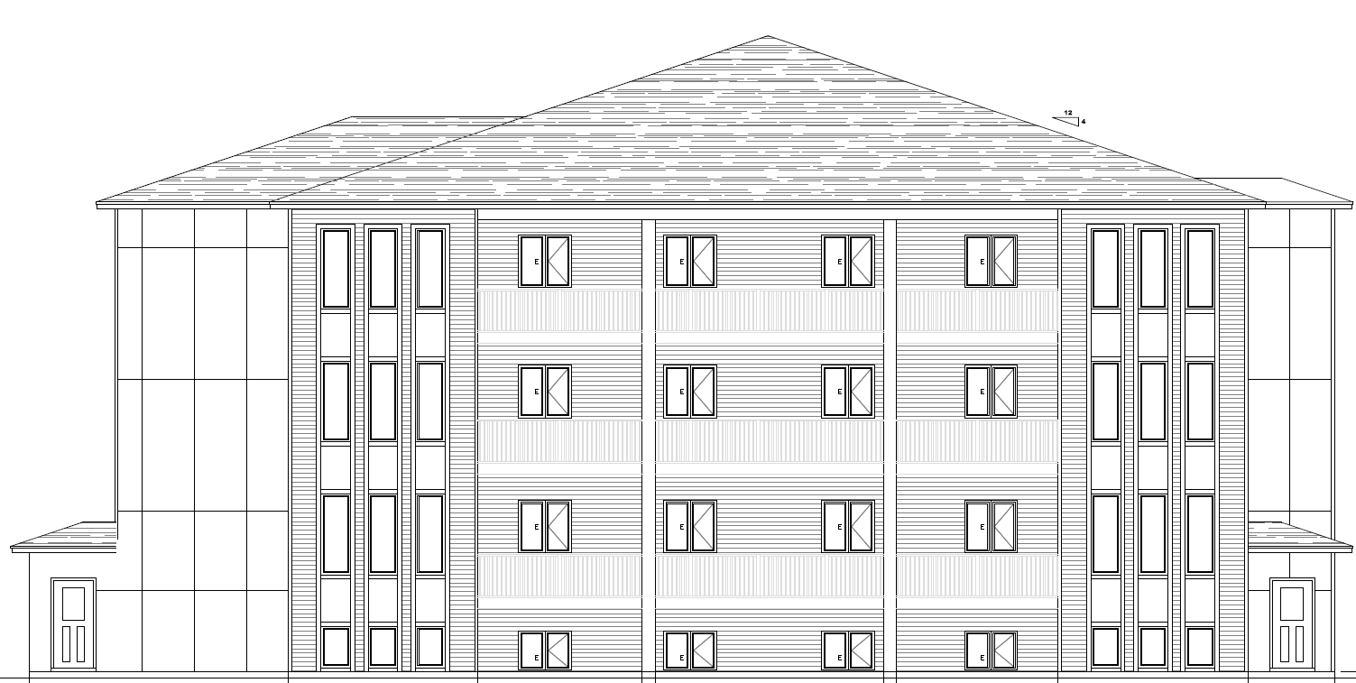 contemporary exterior shot please render the building that is shown using hardie board lap siding for the areas shown with horizontal siding use hardie board panels in black color for the staircases on the sides of the building use black asphalt shingles for roof each floor has a wooden patio deck with black rails running across the four windows in the center architecture