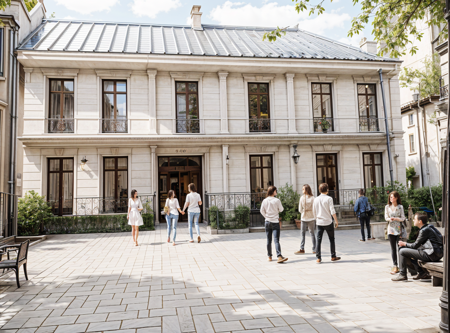 perspective shot a modern minimalist interior space with high ceilings featuring a glass walled conference room on the right include a cozy seating area with a dark brown plush sofa and a black coffee table on a circular rug in shades of brown and beige adjacent is a small glass enclosure with two white chairs and a small round table add vertical wooden panels on the wall in warm medium brown with contrasting black accents place a vibrant green potted plant in a white pot adding a touch of nature utilize natural light coming through a large window with a clear blue sky visible outside create a serene professional atmosphere with a color palette of soft grays warm wood tones and pops of greenery architecture
