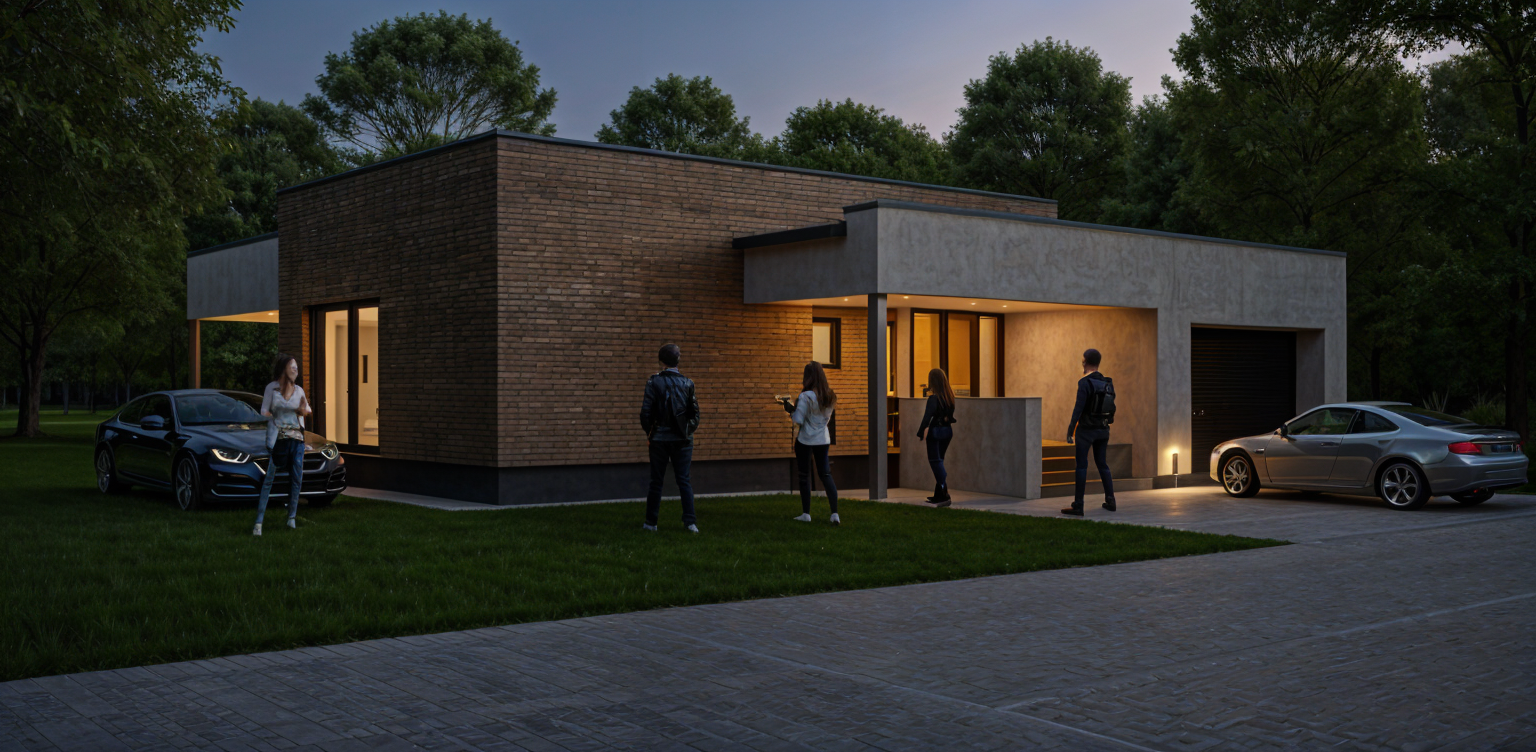 black metal roof black timber shiplap cladding black window frames extensive native planting lawns sunset interior lights on