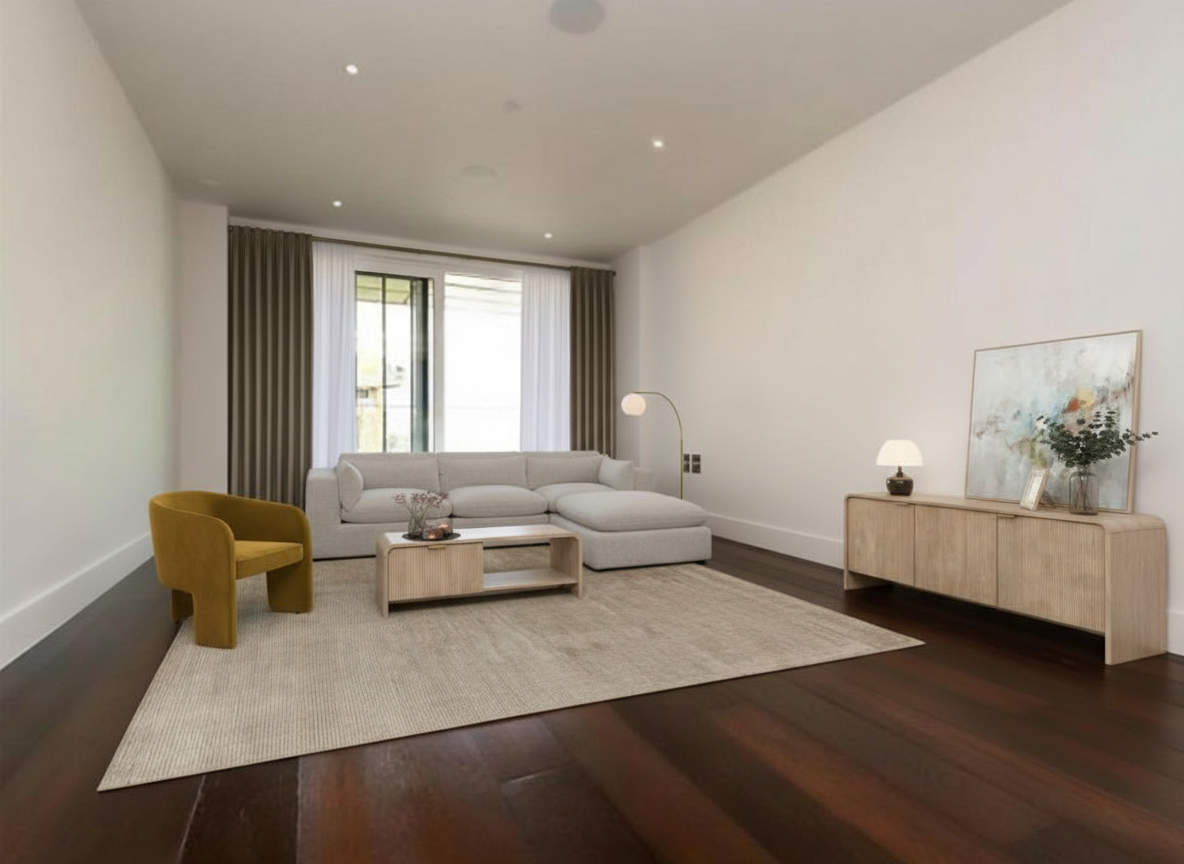 exterior shot add beautiful modern luxury curtains and white sheer voiles to window the sofa should face the sideboard sofa should be on left hand side wall