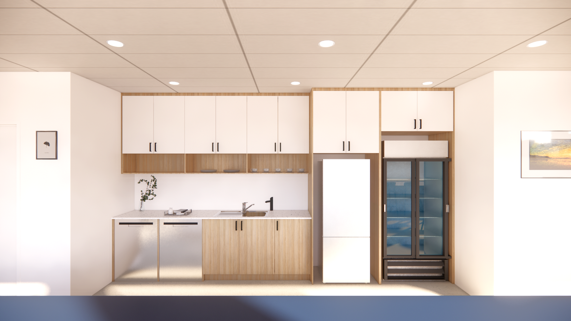 make it more photorealistic whilst adding navy blue to the bottom cabinets and white oak for the overheads