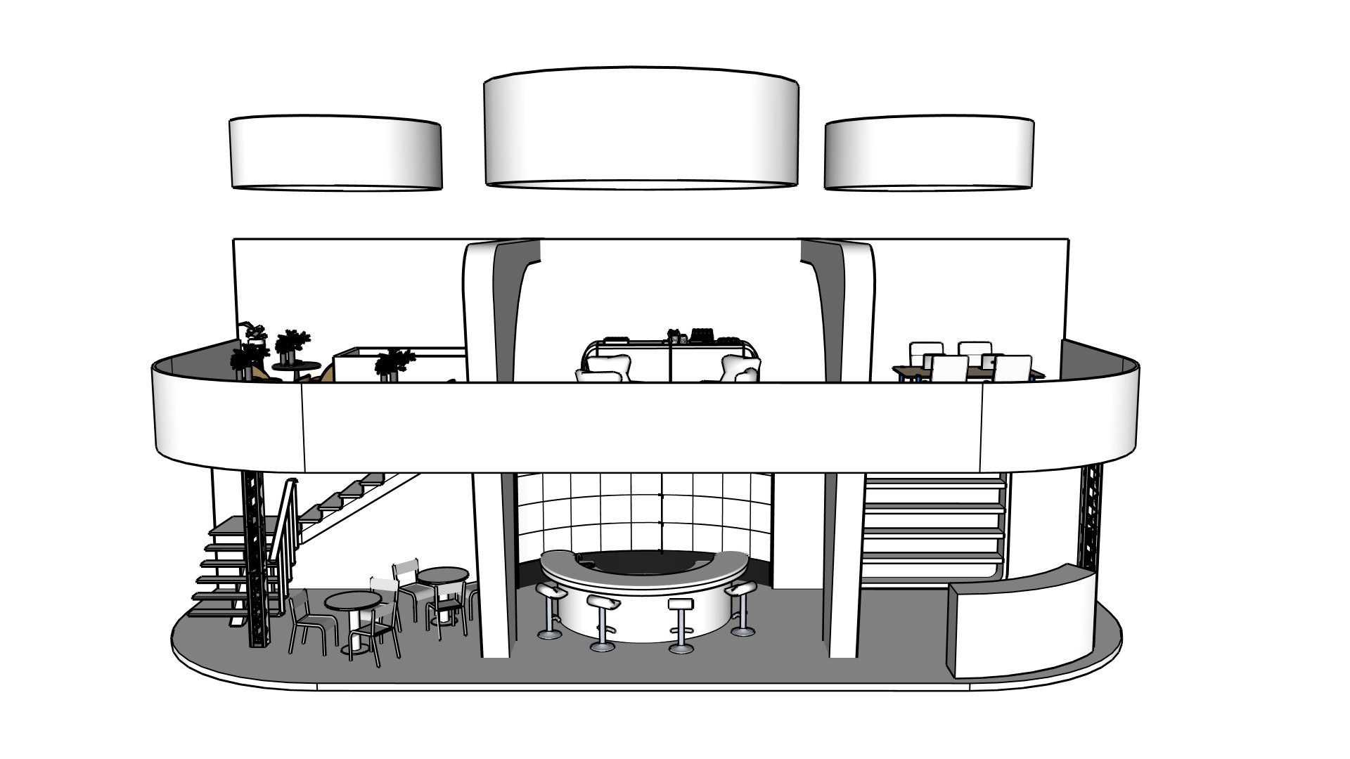 futurism exterior shot render a modern interior with a futuristic aesthetic use sleek white for the walls and ceiling combined with metallic silver finishes for the bar stools and railings incorporate warm natural wood tones for the flooring and tables add lush green plants on the upper level for a touch of nature the lighting should be soft and ambient with subtle blue undertones to create a calming atmosphere emphasize a clean minimalist design with elegant curves and open spaces architecture