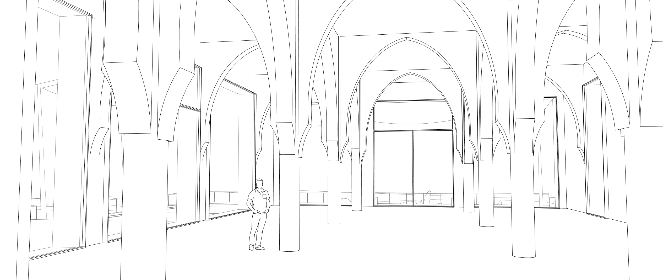 modernist exterior shot high definition photograph of an elegant modern and minimalist restaurant interior with high ceilings and clean arabesque pointed arches the space features a double row of sleek structural pillars and vaulted ceilings creating a bright and airy atmosphere large side openings with expansive glass panels allow natural light to flood in and reveal a stunning view of a lake at a lower elevation outside a lush garden with palm trees orange trees and lavender stretches towards the water the interior combines moroccan inspired elements with contemporary minimalist elegance accommodating approximately 150 seats with refined and comfortable furnishings shaded outdoor terraces with modern sailcloth canopies are visible through the glass seamlessly blending the indoor and outdoor spaces architecture