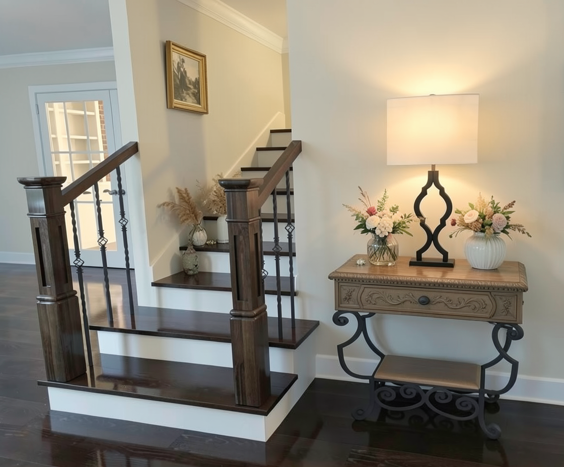 lightly accessorize stairwell and change the accent table to something more modern do not add anything onto the actual stairwell or steps or railings