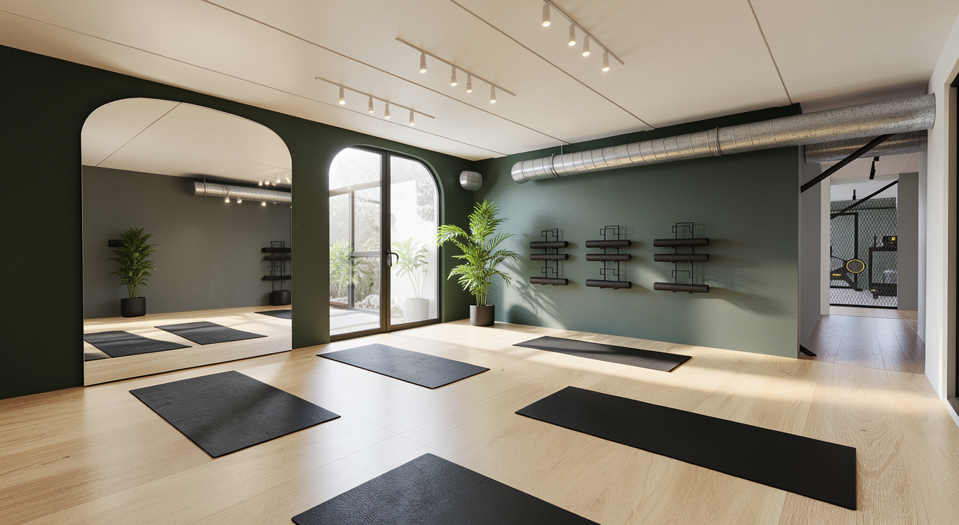 e una sala yoga a terra abbiamo un pavimento in parquet in rovere chiaro continuo a liscio sulla parete di destra ci sono in alto tubi in acciaio zincato sulla parete di sinistra ci sono due grandi specchi a forma di arco