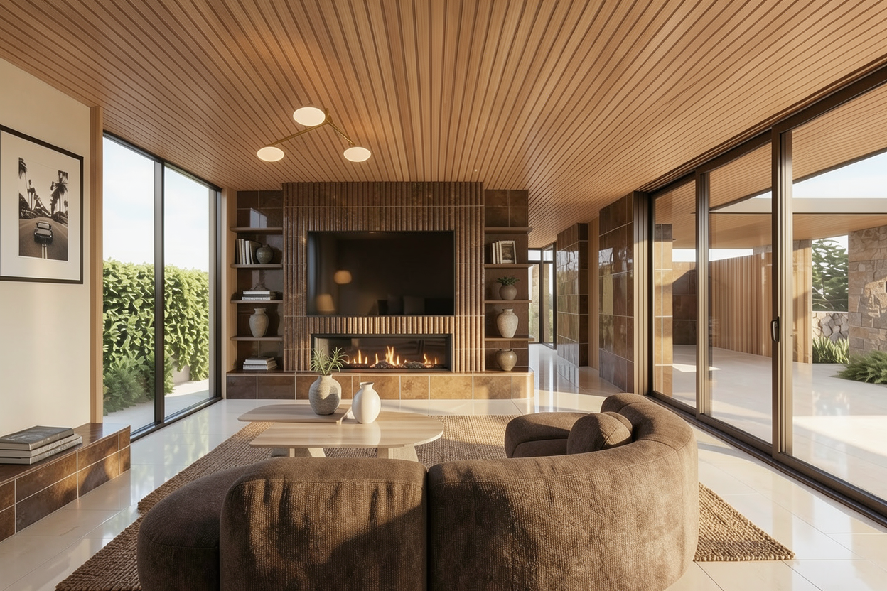 children playing outside high desert mountains in the near distance fabric couch white oak table and chairs
