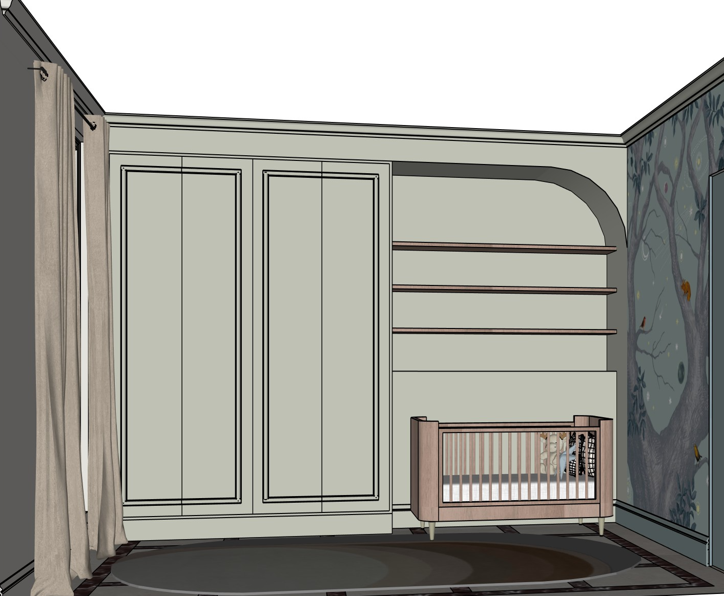 the walls are in light greige the wall with the closet is in farrow and ball mizzle color style the shelves with a scandinavian kid room decoration the floor is in beige marble with rosso levanto marble lines please put an oval light beige rug with a design pattern above this marble flooring the shelves are in oiled oak it should have a more moody vibe like style by colin king there is a wallpaper on the wall to the right