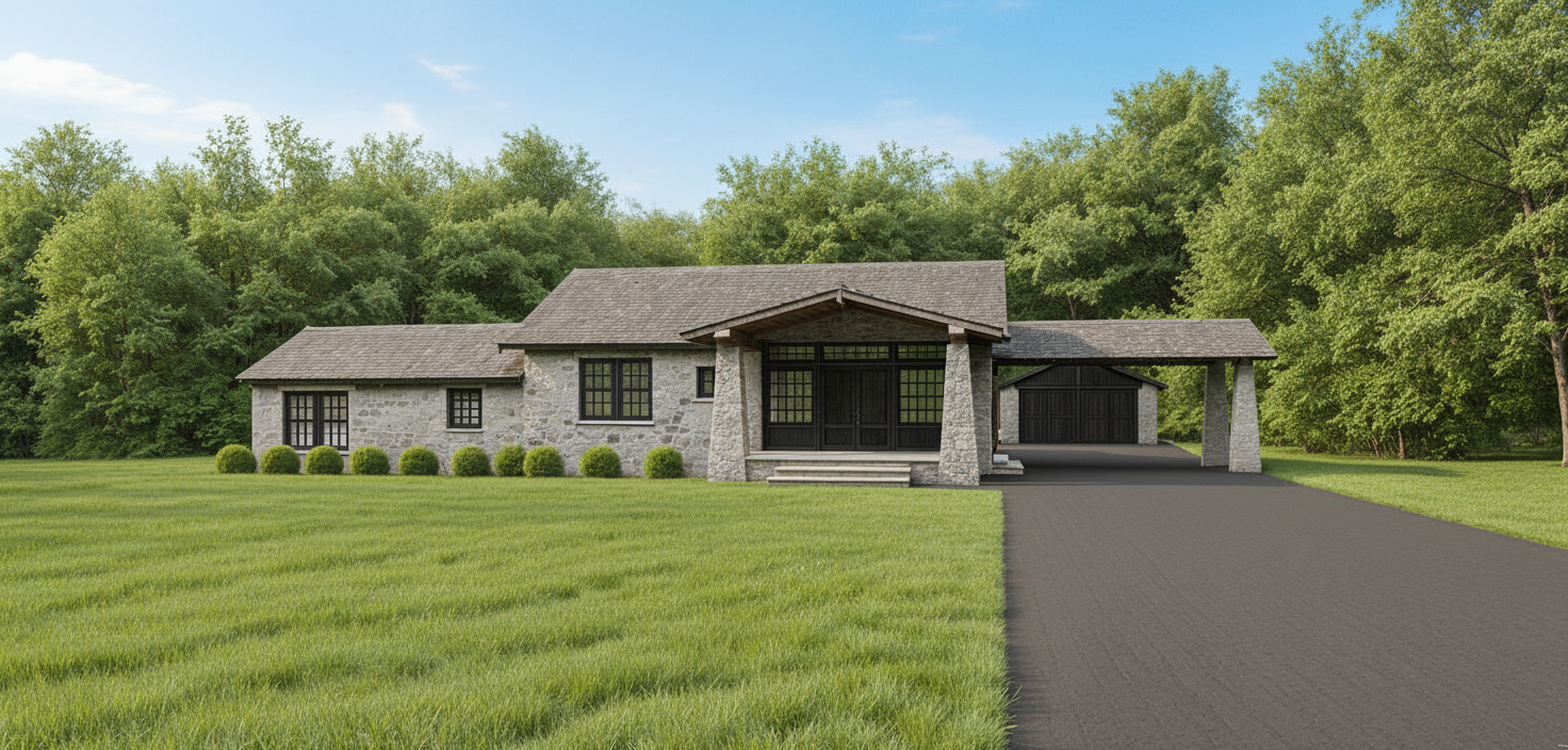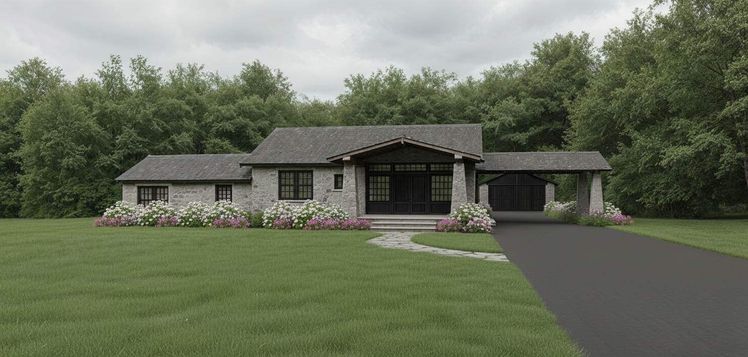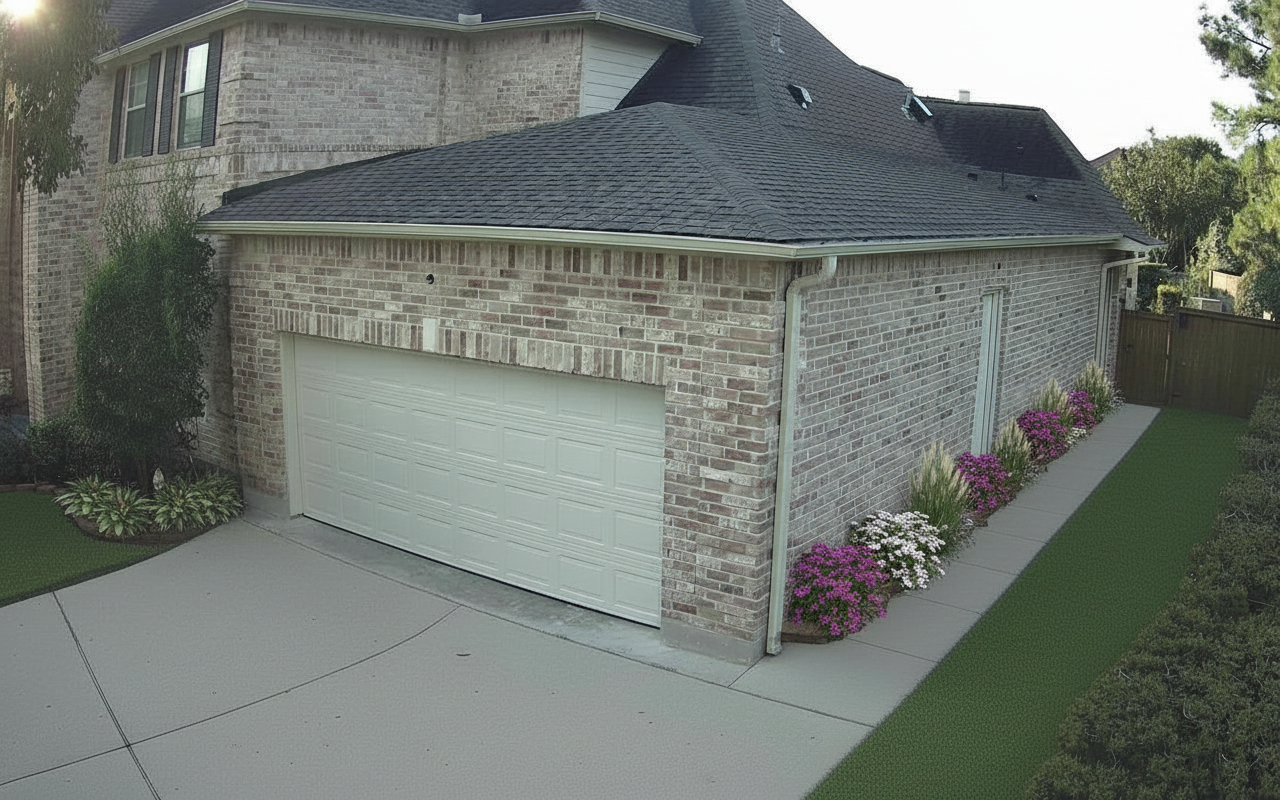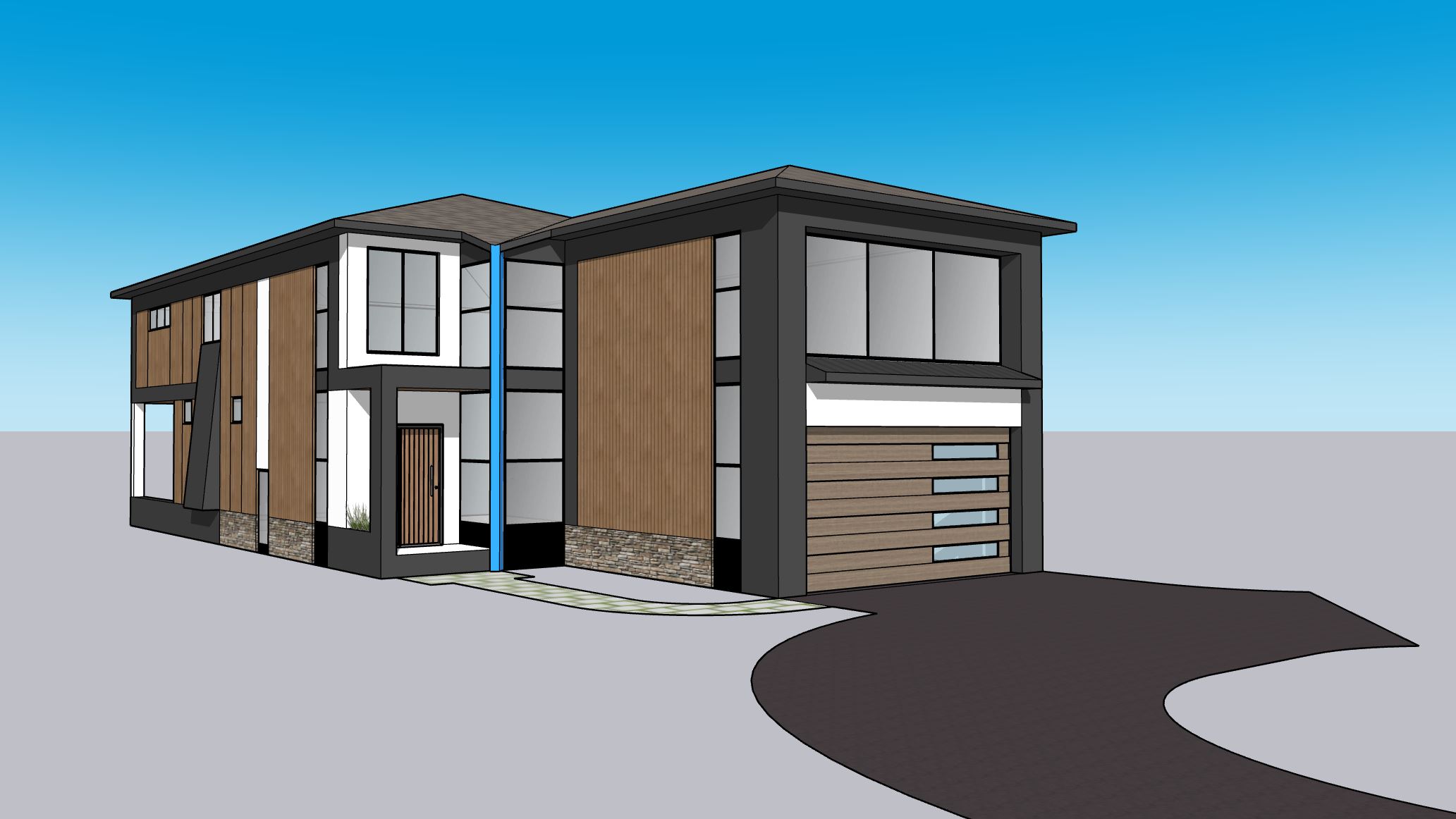 modern exterior shot modern two story house with sleek minimalist design facade features natural wood panels in warm oak tones and crisp white walls large glass windows with black frames entry door in rich mahogany with adjacent small greenery for a fresh accent dark gray roof and garage door with horizontal glass inserts for modern touch surrounding area with smooth even pastel concrete leading into smooth dark gray driveway clear blue sky gentle sunlight illuminating the structure atmosphere serene and contemporary elegance architecture