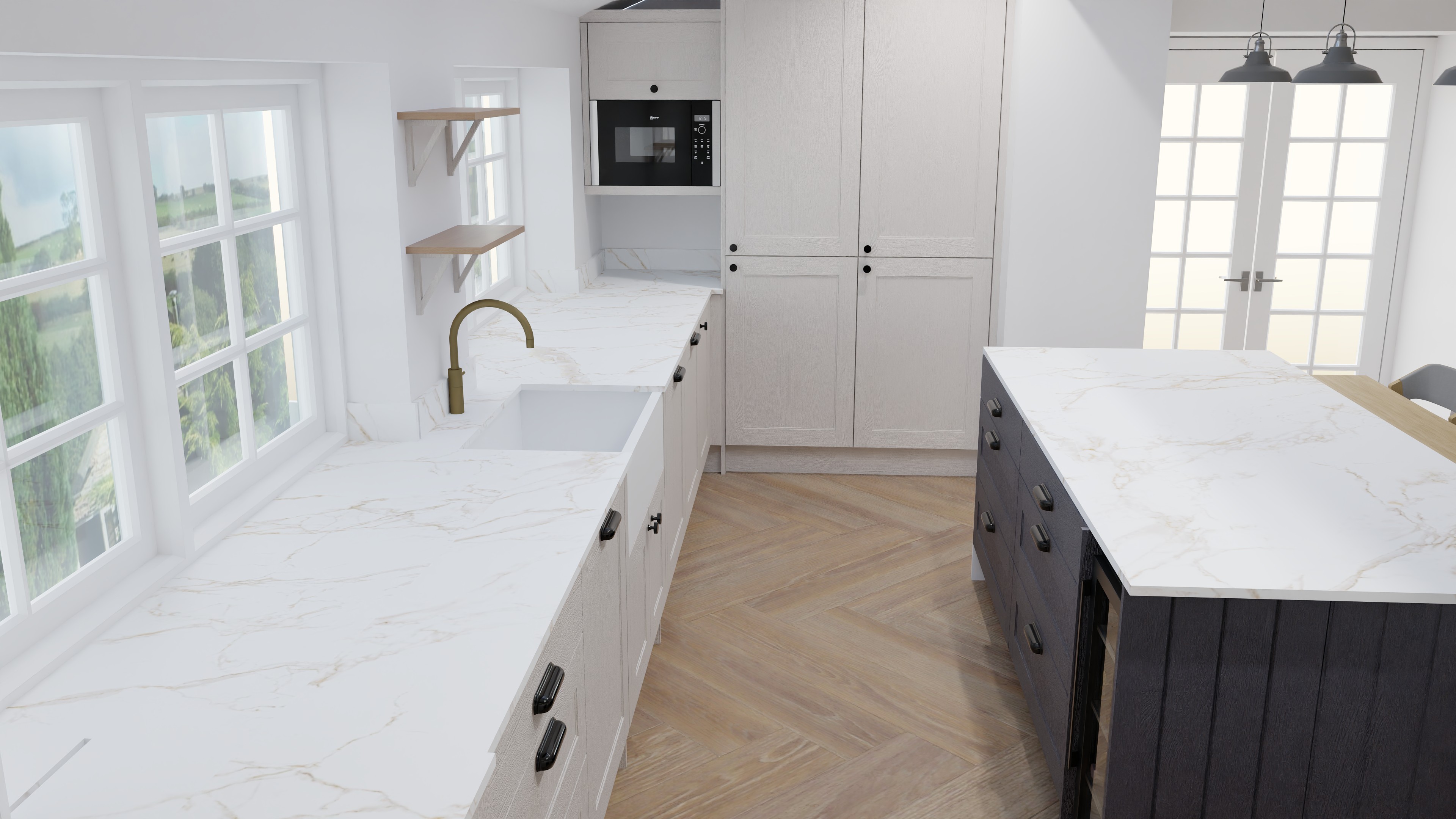 dress shelves above sink peace lily on island top books under microwave and a chopping board with vegetables in front of the window
