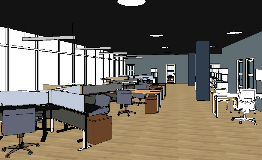 stay true to colors ceiling is black act system tiles make the work stations navy blue with natural wood tones on desk surfaces