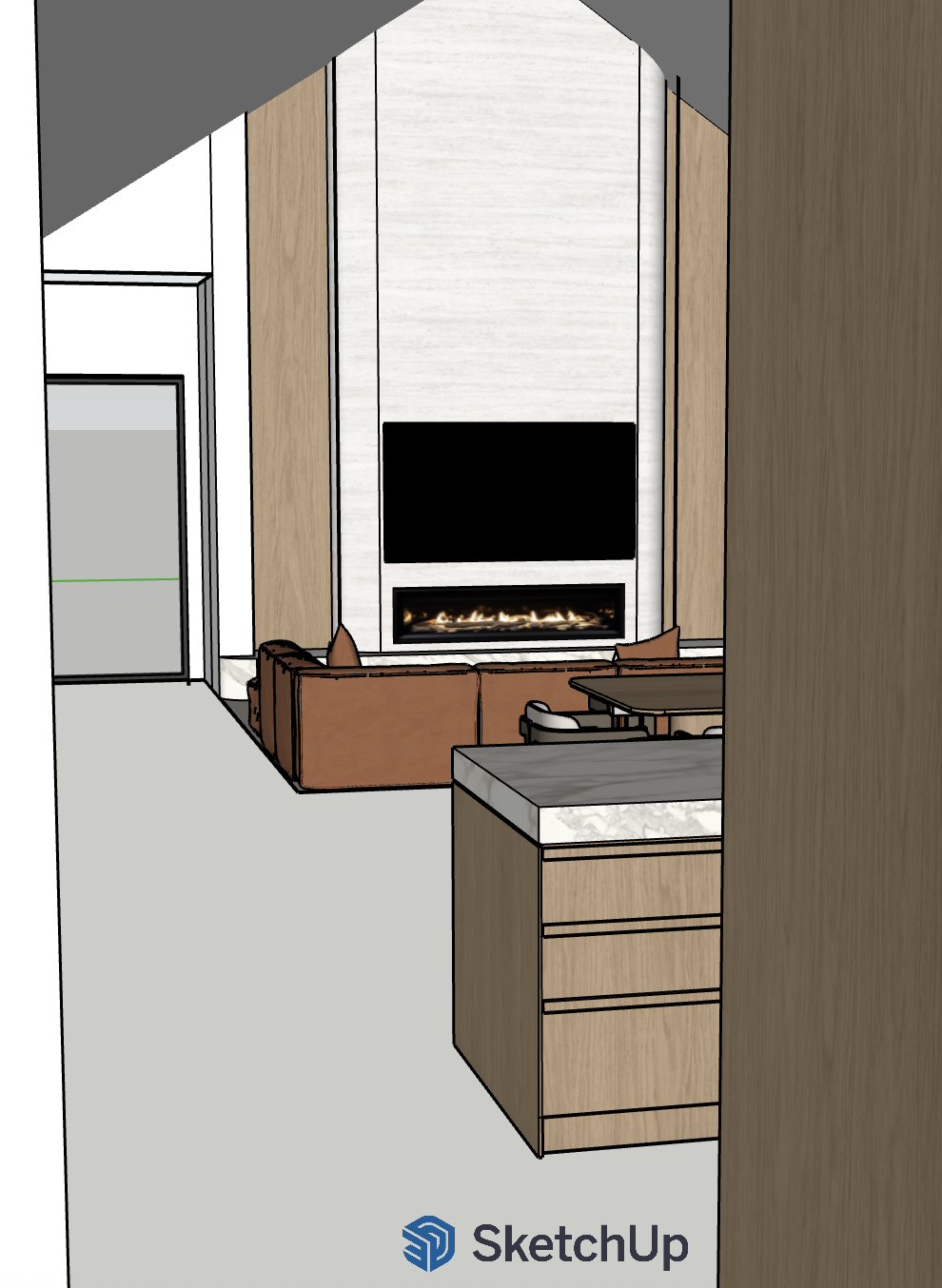 render a modern cozy living room with a high ceiling the walls are smooth painted in soft white on the right a fireplace is embedded within a wall clad in travertine stone with flames glowing warmly the brown leather sofa faces the fireplace adding comfort a wooden dining table with matching chairs is part of the setting the kitchen counter on the left showcases a marble countertop with light cream veining and polytec botson oak cabinetry beneath soft ambient lighting provides a warm and inviting atmosphere while sleek modern design elements enhance the contemporary feel the overall color palette is earthy and neutral combining whites beiges light grays and natural wood tones creating a welcoming ambiance there is an australian native garden outside the window and the flooring inside is a creamy concrete look tile