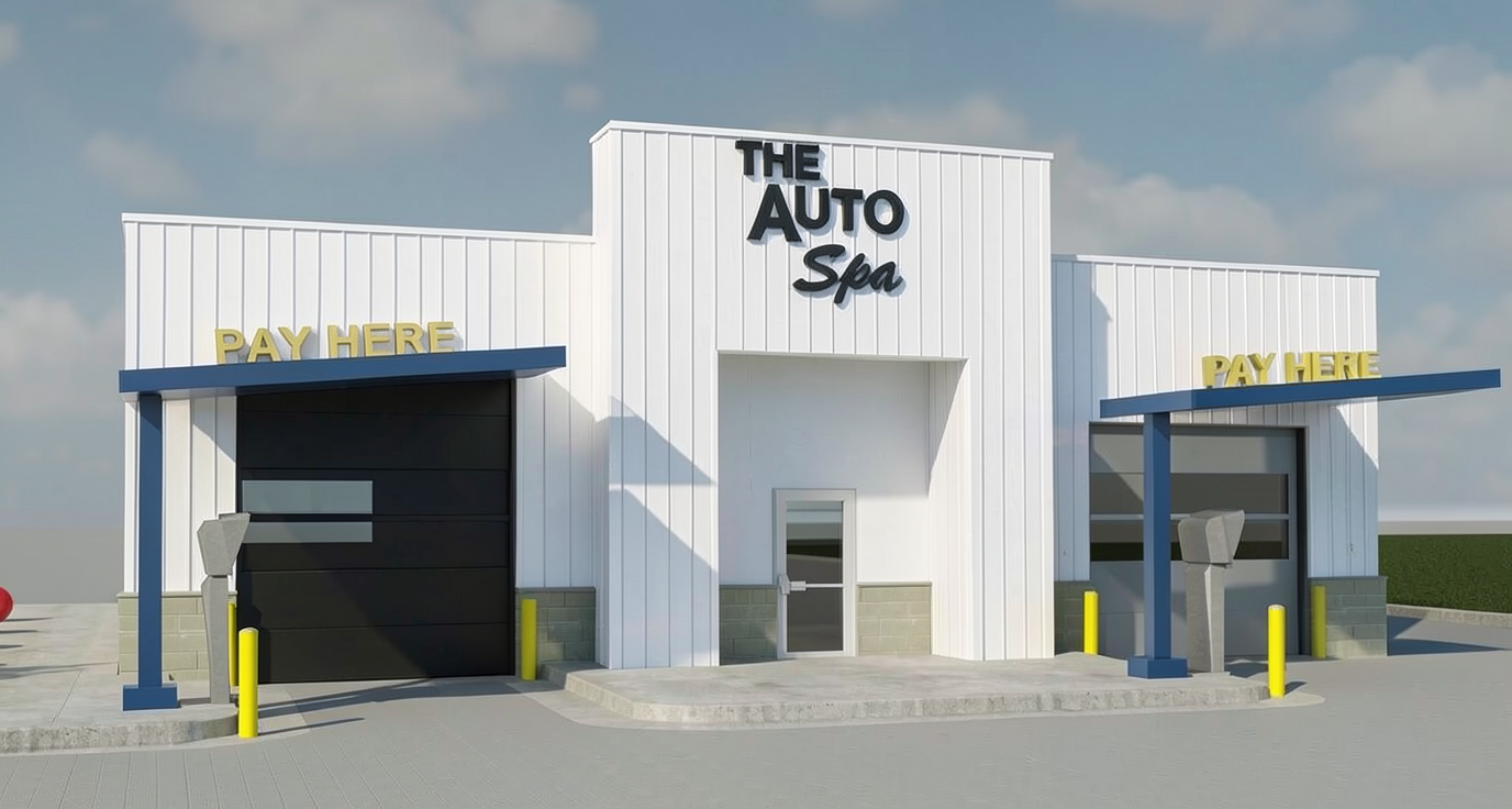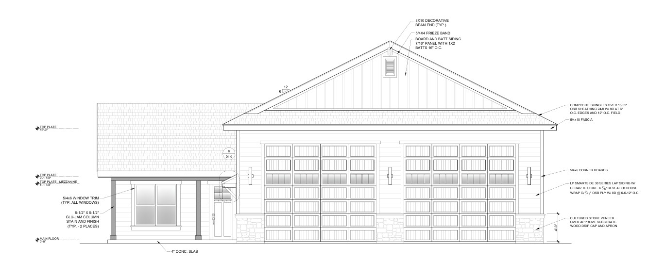 render this elevation of a shop do not change the architecture add any roof lines etc do not add glass to the garage doors the beams and posts should be stained wood the siding and trim should be color indicative of the pacific northwest architecture the trim should be a dark grey colors