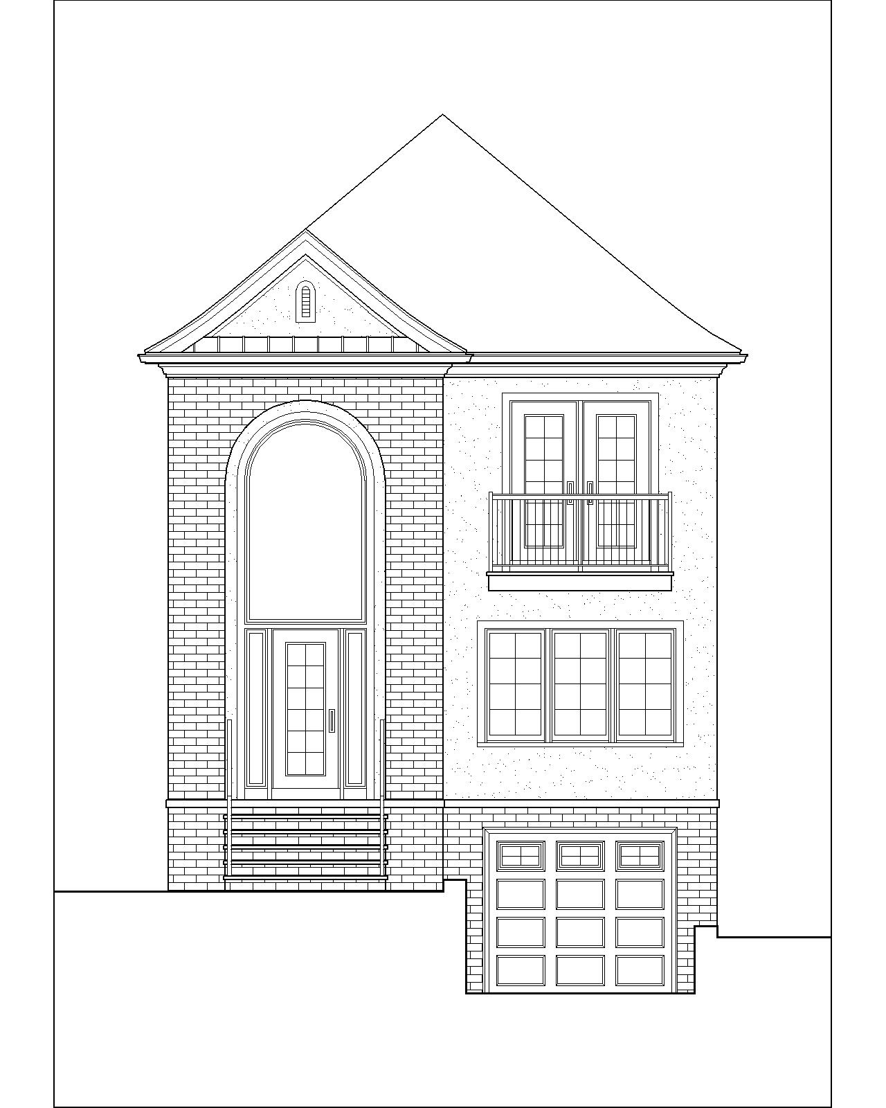 render this elevation realistic in a setting with some landscaping in a residential neighborhood the windows and doors should be black the brick should be a natural color and stucco should be in a warm light brown cream