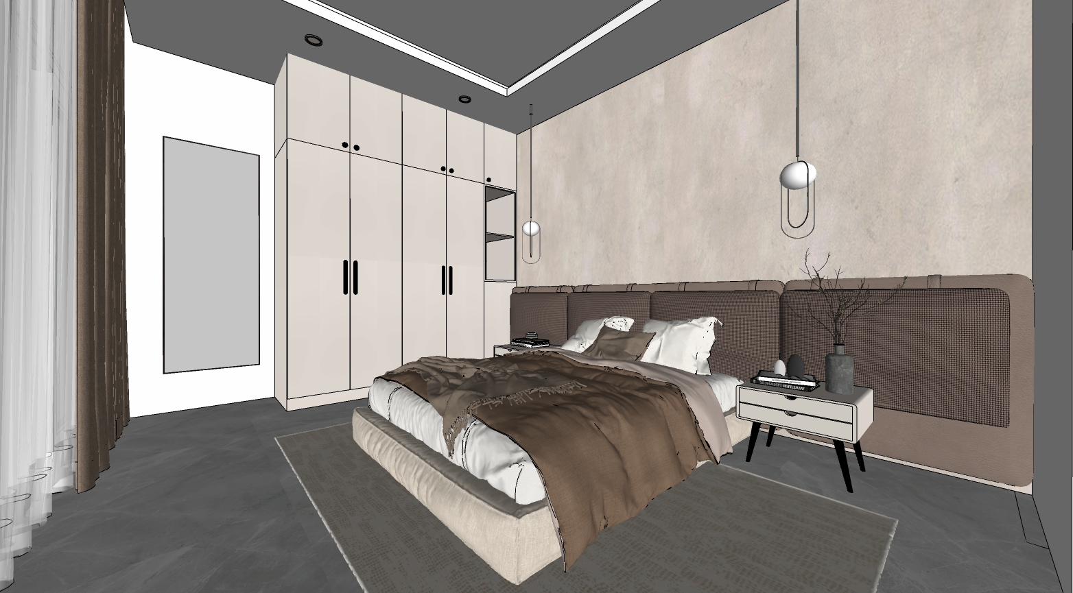 create a realistic render provide cove lights and illumination for the light fixtures add artwork in the headboard wall add mirror reflection on the mirror near the wardrobe a reflection of a wooden door is to be seen on the mirror