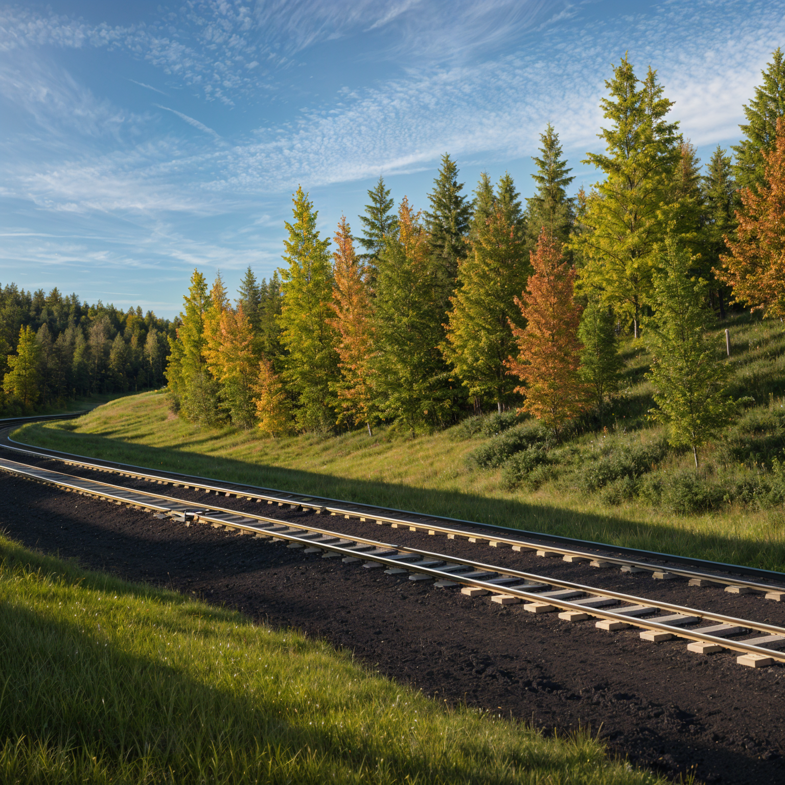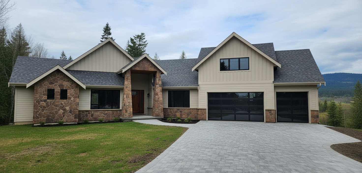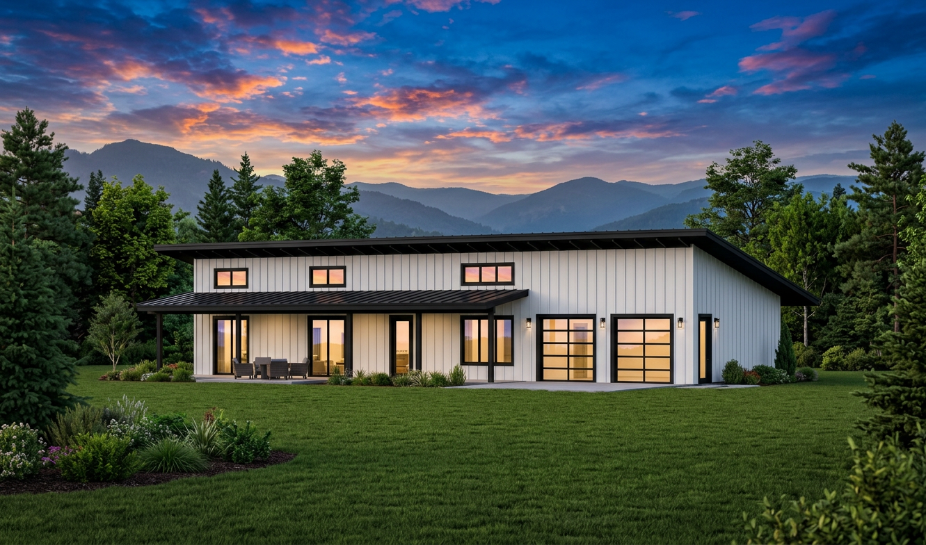 clean modern barndominium architectural exterior home rendered in cinematic vibrant dusk lighting with blue skies and vibrant clouds barndominium in a lush beautiful mountain setting with green grass and dense trees surrounding the property warm glow and reflections off of the windows select grade vertical white hardie siding green manicured landscape around structure with gardens and patches of grass black standing seam metal roof high fidelity photorealistic visualization crisp shadow falloff refined facade geometry soft atmospheric depth premium architectural photography mood ultra clean composition and materials photorealistic render black trim around the windows and doors prominent trees scattered around the property black window trim concrete driveway leading up to the garage doors