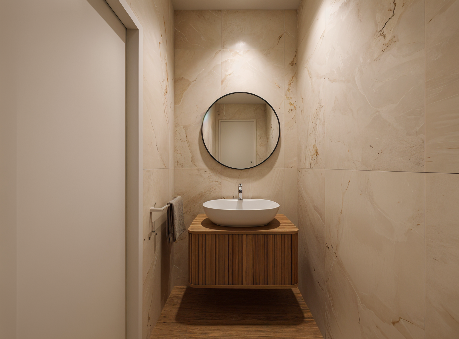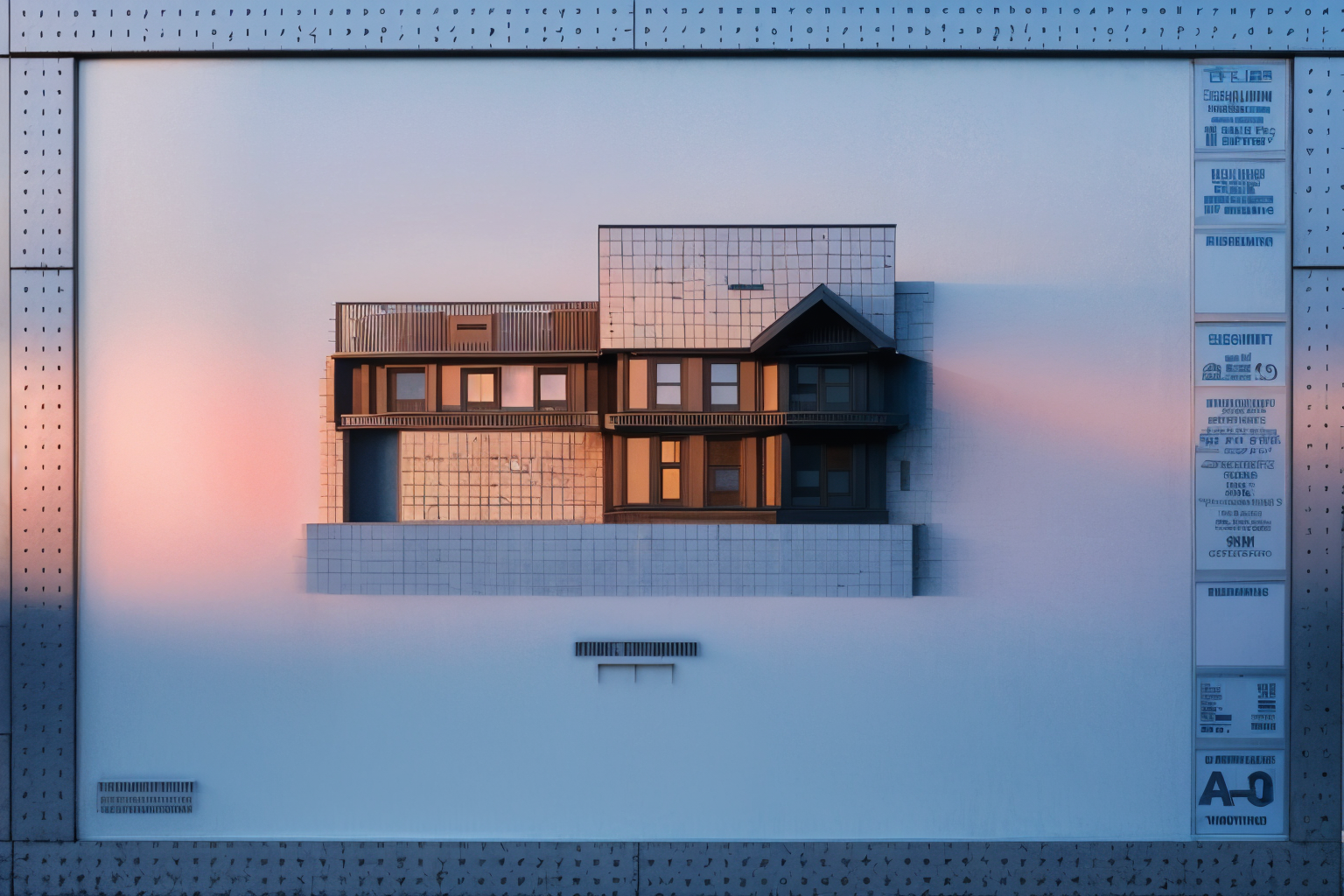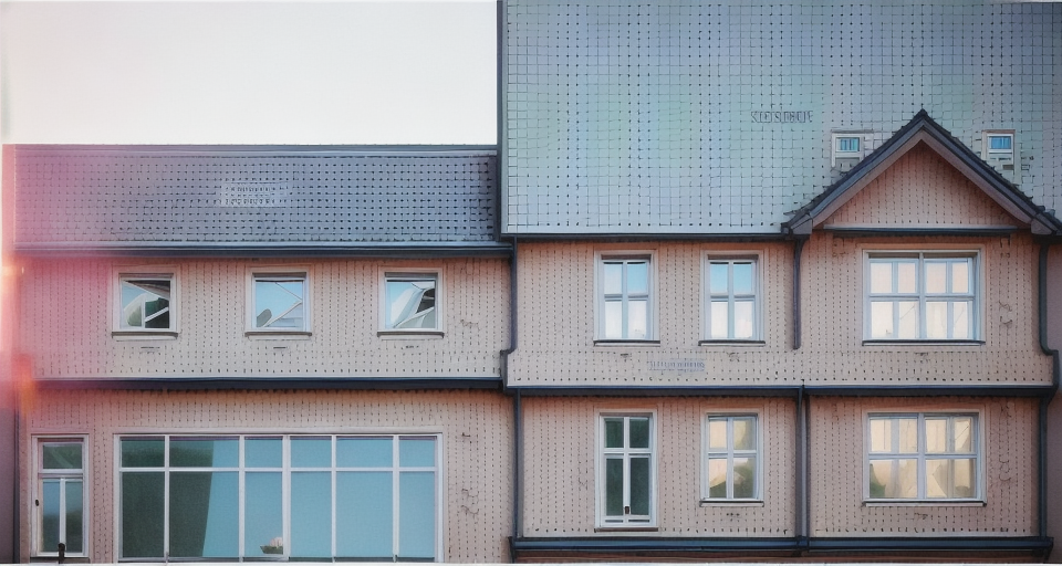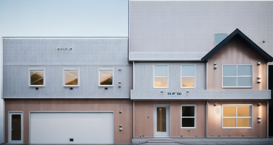 it is a modular house facade is vertical striped prefabricated panels cladding 5cm aluminum black color material is quadroline by hunter douglas in the left module and in the right module fiber cement prefabricated boards cement color this houses are mostly used in outdoors like woods please use a backround accordingly sunny day and in front of the left module and in the floor a deck without furniture in the deck show a living room in the inside use blured window in the narrow window there is only one narrow window