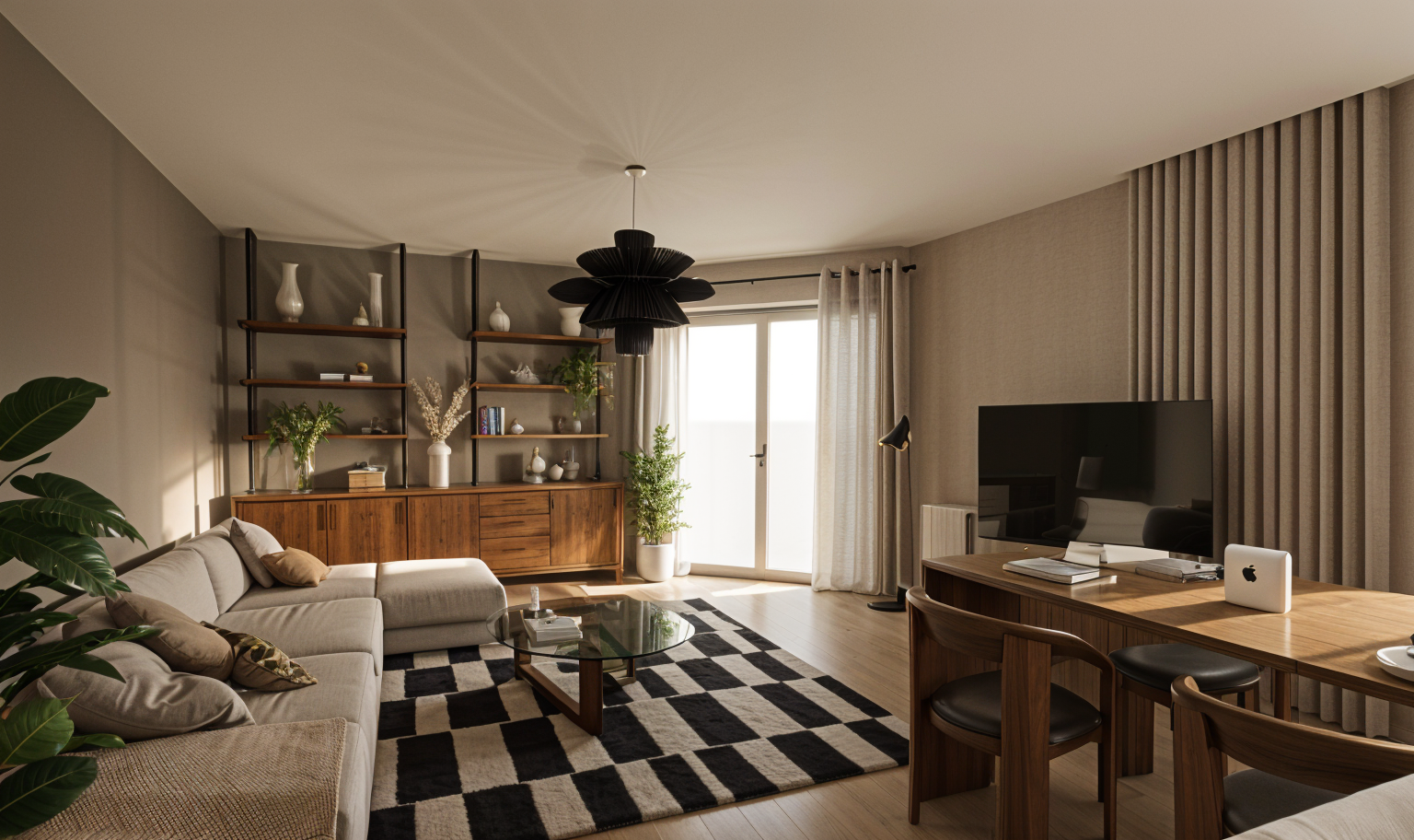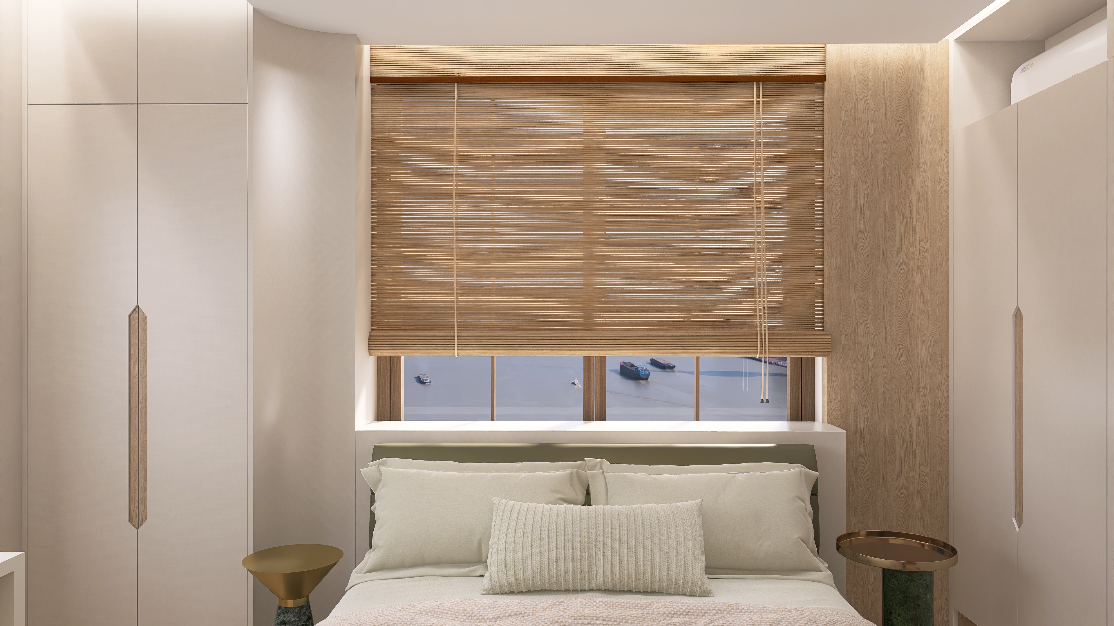 a cozy modern bedroom with calming neutral tones the walls and wardrobe are in a soft ivory color creating a serene and spacious feel the textured wooden blinds and wall panels are in warm light oak adding a touch of natural warmth the bed is adorned with plush cream colored pillows and a matching duvet enhancing the cozy atmosphere the bedside tables are a sleek bronze with a hint of green from the base providing a subtle contrast the room is bathed in gentle natural light filtering through the window creating an inviting and tranquil ambiance