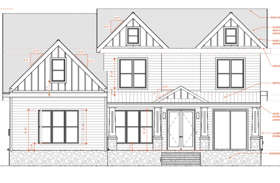 modernist exterior shot please create a transitional render using dark siding lighter stone architecture
