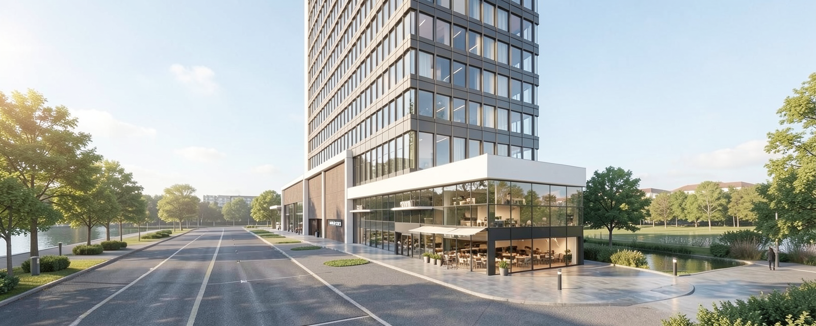 maintain mass add retail and cafe at ground floor on left mass only daytime view no cars glass tower above remove people