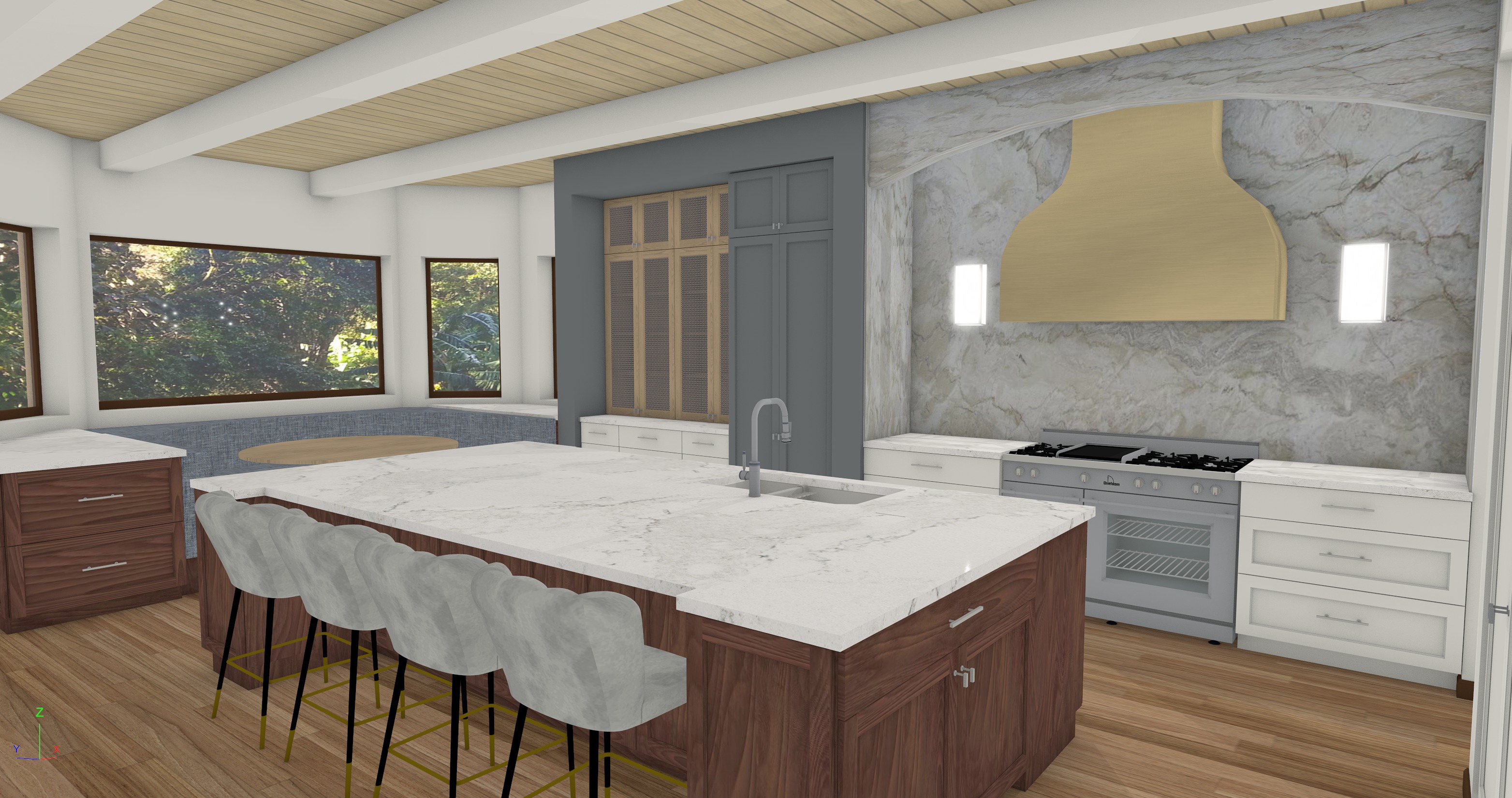 make this rendering look like a real photograph it is mid day the hood matte brass the wood upper cabinets hace metal mesh inserts the ceiling is wood paneling with white painted beams