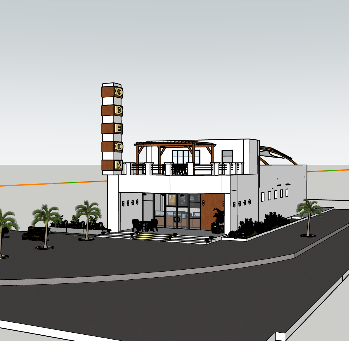 use the uploaded image as the base reference maintain the structure and proportions of the existing odeon cinema in downtown djibouti keeping the illuminated vertical odeon sign as a glowing focal point preserve the white stucco facade and soft mediterranean forms but elevate the overall design with refined materials plastered surfaces natural stone accents and warm wood detailing set the scene in late afternoon with soft shadows and warm sunlight washing over the building add a grand entrance with sculptural planters integrated ambient lighting and elegant outdoor seating under shade elements the surrounding street should feel alive with pedestrian movement soft landscaping and subtle cues of downtown djibouti palm trees light traffic and regional textures include rooftop access with simple railings or integrated lounge seating creating a calm upper terrace the design should feel modern yet grounded evoking nostalgia with restraint and elegance focus on architectural simplicity inspiring shapes and a cinematic atmosphere true to asta studio s aesthetic of spatial heritage and contemporary refinement