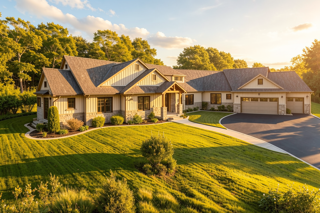 render a photorealistic 3d perspective of this house in a slovakia reference the current material style just enhance them keep model geometry the same windows doors roof walls garage door pavement driveway make vegetation more real do not change the view only enhance the current materials and make the landscape nicer vegetation and glass reflections and a vibrant clear sky with light atmospheric depth render in hyper realistic architectural visualization quality 8k resolution