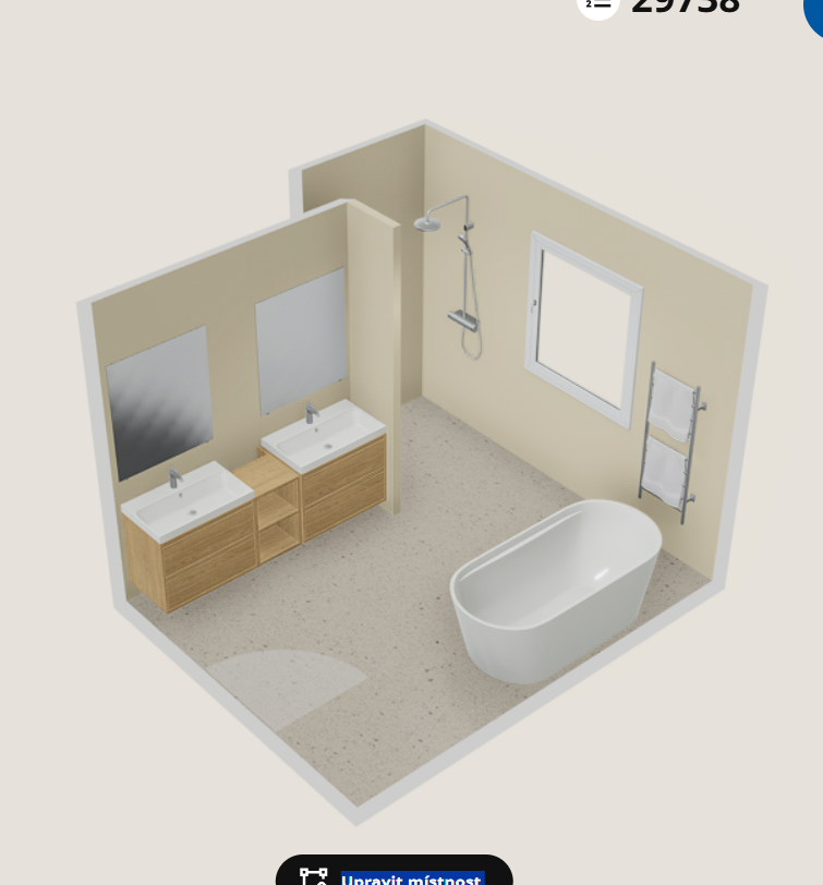 make it into a realistic design so it looks like a photo the window frame should be natural oak not white combine the mirrors into one large mirror and make the sinks a single continuous vanity running across the entire wall on the wall by the bathtub and the toilet we want a built in shelf running the full width a typical drywall false wall construction but not a niche open along the top across the whole length we like earthy tones but in one spot we d like to try small light green tiles please try to create a design proposal