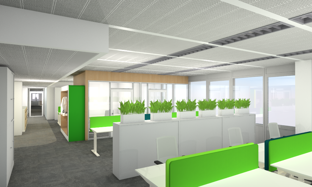 transform the provided office interior image into a high end photorealistic render with naturalistic atmosphere soft glowing while keeping everything exactly the same same proportions same booth seating same ceiling curves same wall finishes same floor finishes same materials and same spatial configuration do not move or alter any objects geometry textures colors or furniture positions the chairs throughout the office must remain exactly in the same locations and proportions but their materials should read realistically with subtle natural sheen and cushioned tactile texture while keeping their shapes frames and positions unchanged including on the office supplies while keeping all tables and chairs in their exact positions
