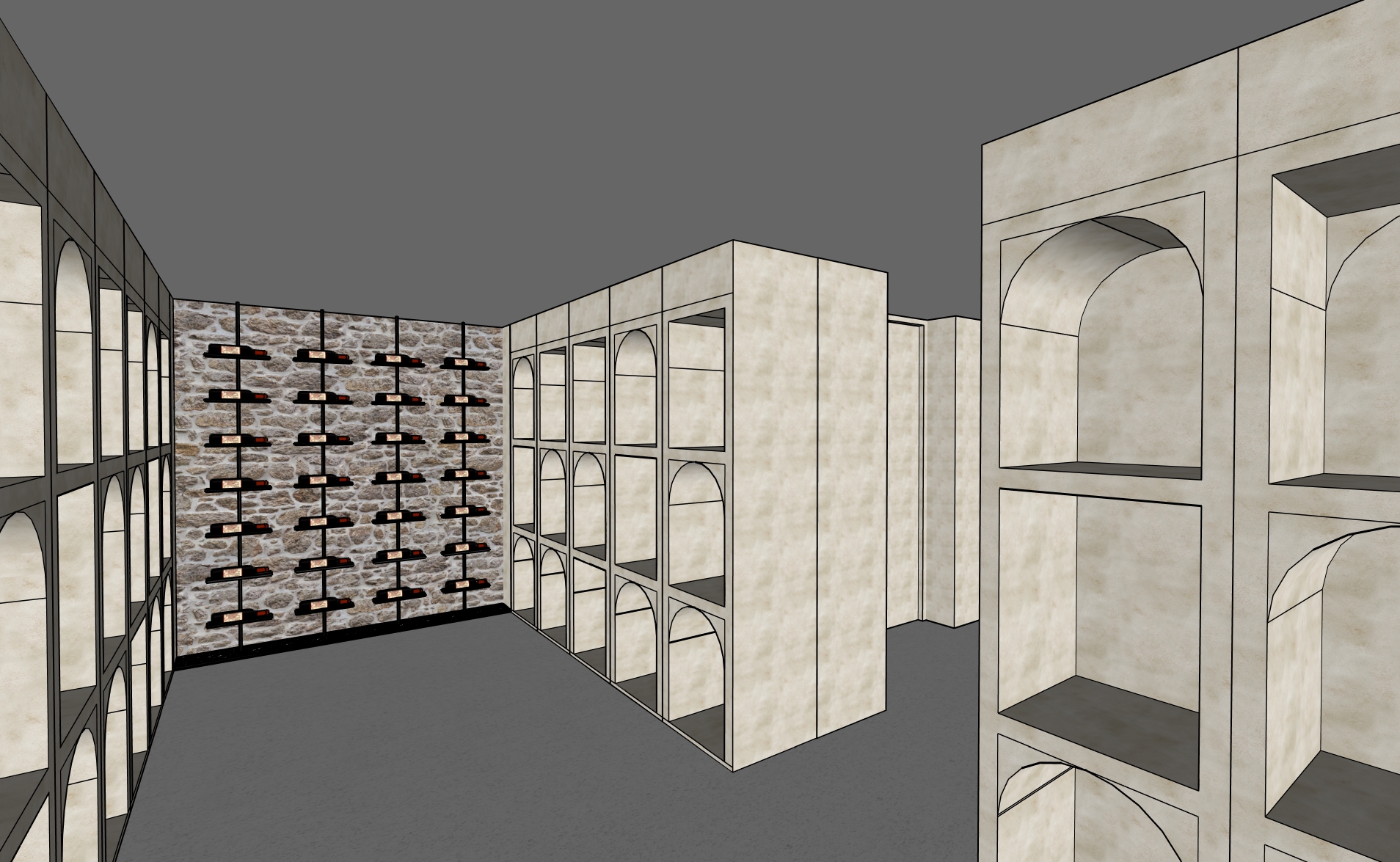 transform the provided wine cellar interior image into a high end photorealistic architectural render while keeping everything exactly the same same layout same wall positions same proportions same arches same shelving geometry same spatial configuration and camera perspective do not move remove resize or redesign any architectural element the space is an elegant contemporary wine cellar with refined minimal architecture and warm atmospheric lighting all walls must appear finished with soft beige lime plaster lime plaster finish with subtle natural texture mineral variations and matte depth typical of traditional lime render the floor must appear as polished waxed concrete b ton cir in a smooth medium warm grey tone with very subtle reflections and natural micro texture the stone wall at the back of the room must appear as natural rustic stone with realistic depth irregular stones and mortar joints add a warm hidden backlighting system behind the wine bottle supports so that the stone wall receives a soft indirect glow creating dramatic shadows and highlighting the texture of the stone all the arched niches and shelving units must remain exactly the same shape and position but should include warm integrated backlighting inside each niche creating a soft halo effect that emphasizes the architectural arches inside each niche and shelf add realistic wine bottles arranged elegantly and evenly bottles should vary slightly in color dark green brown black glass with realistic labels subtle reflections glass transparency and visible wine tones on the metal bottle supports on the stone wall include horizontally stored wine bottles with realistic shadows and reflections lighting should feel like a refined atmospheric cellar lighting design warm indirect architectural lighting soft led backlighting in niches gentle illumination washing the lime plaster walls subtle highlights on bottle glass controlled contrast emphasizing depth and materials enhance material realism with lime plaster mineral texture natural stone roughness soft reflections on polished concrete floor realistic glass reflections on wine bottles subtle shadow gradients within the arches the final image should feel like a luxury architectural visualization for a high end winery or private wine cellar with ultra photorealistic lighting cinematic depth global illumination soft shadows and premium interior catalog quality while strictly preserving the original design and geometry of the provided image