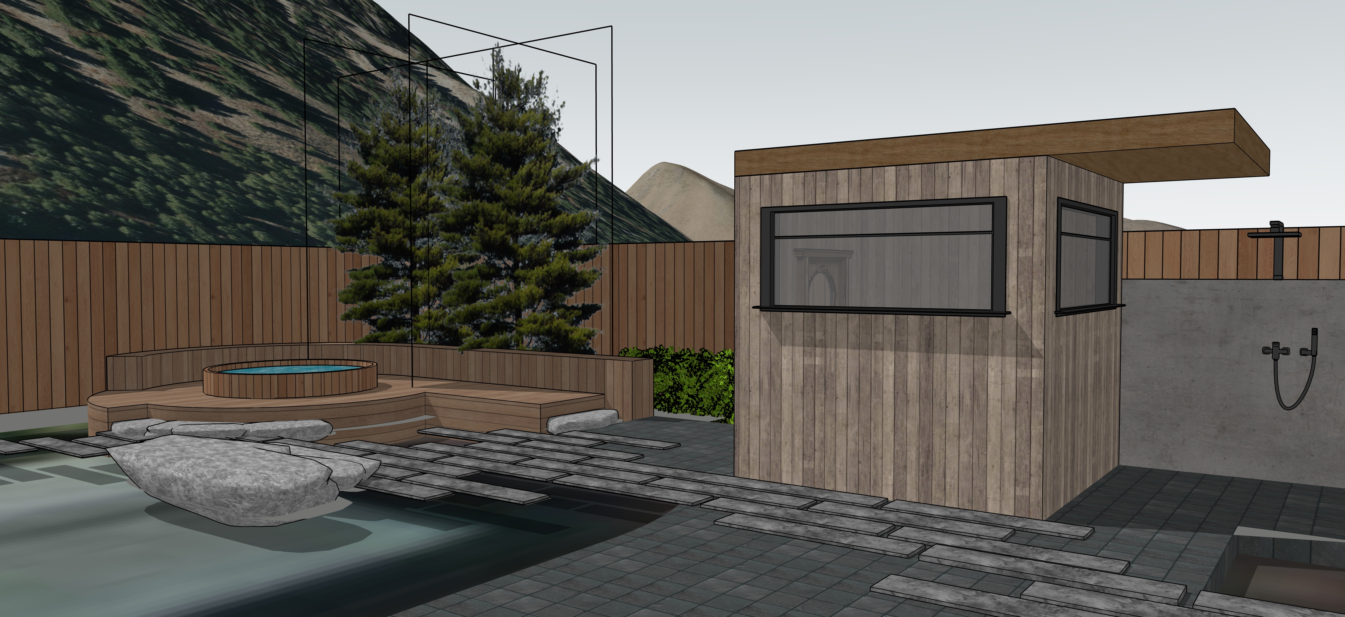 render a photorealistic 3d perspective of this house in a truckee ca reference the current material style just enhance them bronze standing seam metal roof verticle wood siding concrete walls keep model geometry the same windows doors roof walls garage door pavement driveway make a lush vegetation that looks native to ketchum idaho do not change the view only enhance the current materials and make the landscape nicer vegetation detailed textures in the wood siding and glass reflections and a vibrant clear sky with light atmospheric depth render in hyper realistic architectural visualization quality 8k resolution remove the black lines around the trees the square structure on the right hand site has a flat roof