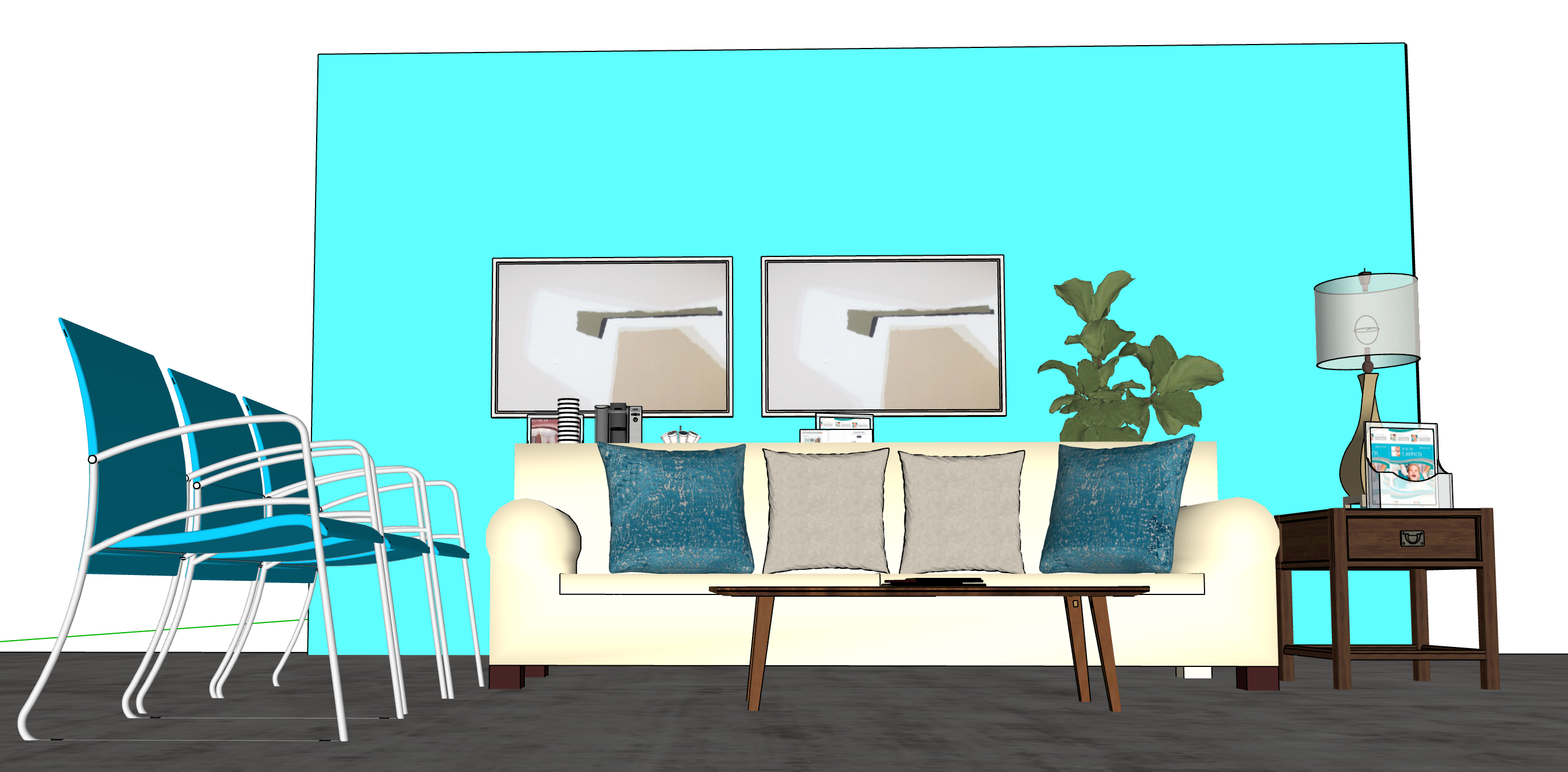 this is for a pampers commercial set the set should be a waiting room modern interesting items that show its a waiting room table with coffee pamphlets flyers magazines the wall is a branded soft teal it has soft abstract art in the background upholstery fabric is tan beige and soft make this look better and use the elelemnts don t make too homey but doctor waiting room