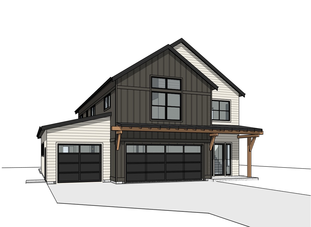 modern house exterior with a minimalist design white lap siding dark brownish black board and batten siding on the main structure charcoal gray asphalt shingle roof large windows with clear glass garage doors in sleek black smooth asphalt driveway serene afternoon light with a clear blue sky casting soft shadow landscaping including shrubs around the perimeter and neatly trimmed grass for a polished finish low mountains in the background