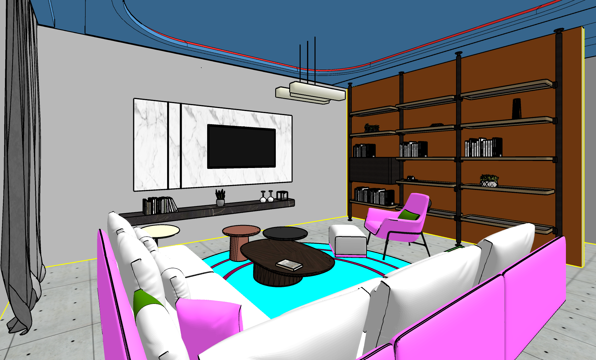 modernist interior shot a hyperrealistic interior scene of a modern luxury living room in daylight the layout and proportions must follow the reference apartment exactly the ceiling has soft sculptural curves with integrated led strips along the edges built in spotlights and a large modern ceiling light fixture above the main seating area include floor and table lamps placed naturally in corners or beside furniture a family or a couple can be present sitting reading walking in or talking but naturally integrated into the scene no posing key materials light oak or walnut floors boucle or linen sofa stone or wood coffee table brass or black metal accents scene includes cushions slightly misaligned a glass of water open book or remote control natural light coming through sheer curtains soft shadows bounce light on walls one or two indoor plants subtly placed everything must feel real and balanced as if photographed in a real apartment no cgi effect camera depth and realistic lighting required architecture