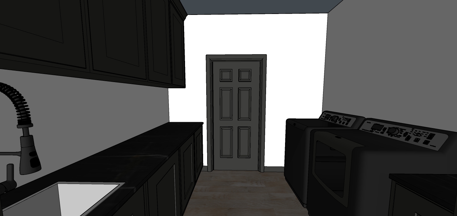 maintain all model geometry this should feel like a high end laundry room in a basement the ceiling should be a dark moody color the cabinets are painted in a semi gloss finish with brass hardware the counters are a dark marble the sink is stainless steel and the faucet is brass the flooring is a wood look lvp the lighting should be soft and elegant