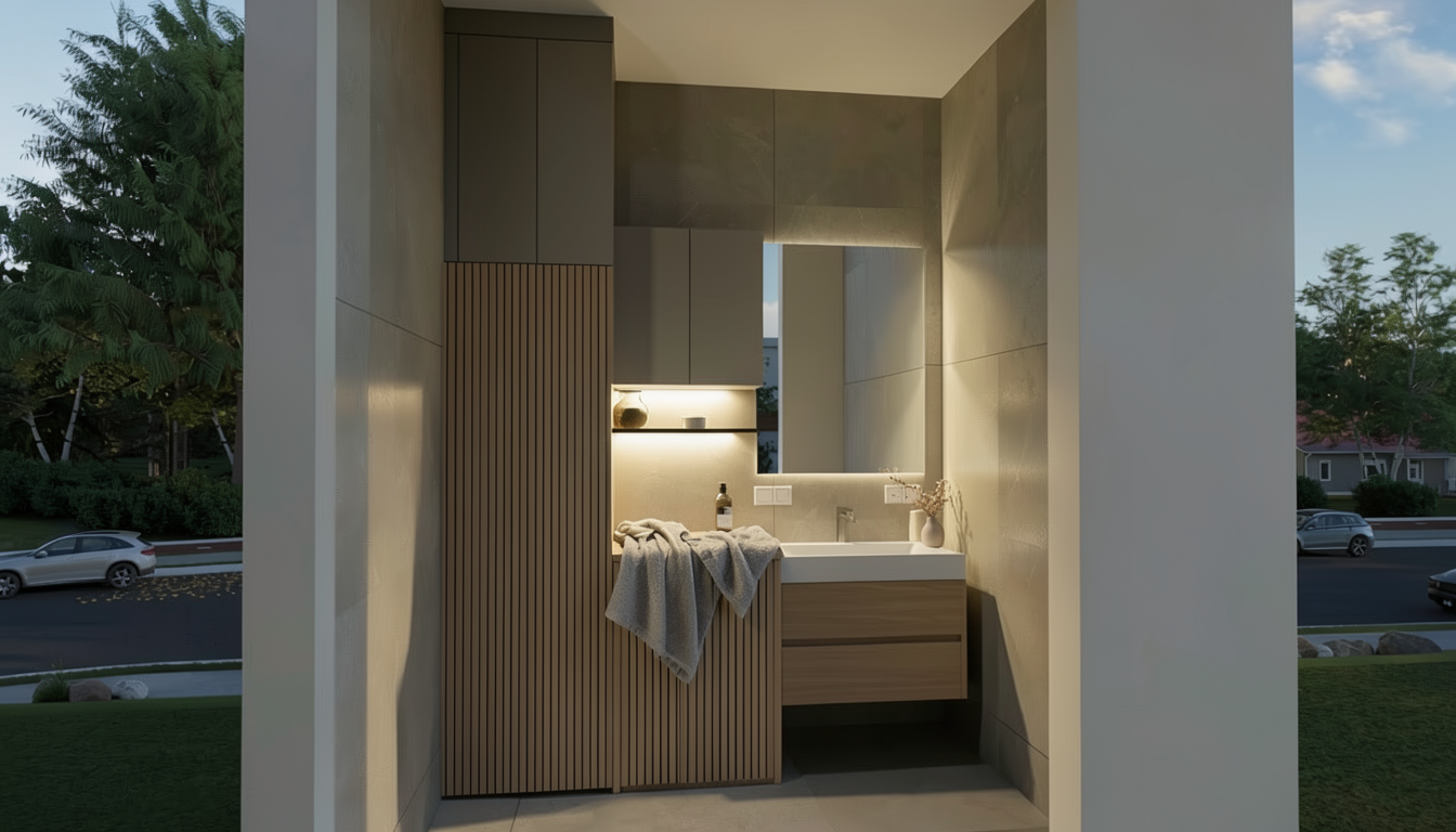 do not change materials adjust color or design just make render more realistic and add garden background outside