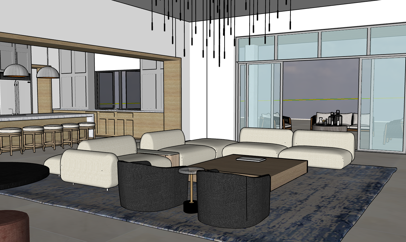 realistic lighting and ambiance hyperrealist photo light beige matte 48 square floor tile all woods are a light neutral oak grey upper cabinets fluted marble fireplace
