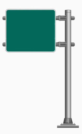 please render an external cantilever road signage in realistic 3d based on the uploaded design the signage panel dimensions are 8 5 meters wide and 7 meters high place the signage on a roadside grass curb during a sunny afternoon the signage is positioned on the right side of a 4 carriageway road facing a large roundabout ahead with palm trees in the background the design should be industrial in approach using a large robust support pole and a cantilever arm that holds the aluminum panel emphasize scale by showing vehicles on the roadway and maintaining accurate proportions relative to the 4 lane width highlight realistic daylight shadows metallic pole textures aluminum panel surfaces natural grass detail and the overall sturdy engineering of the structure render from a dynamic perspective view to capture both the road context and the sign s placement before the roundabout
