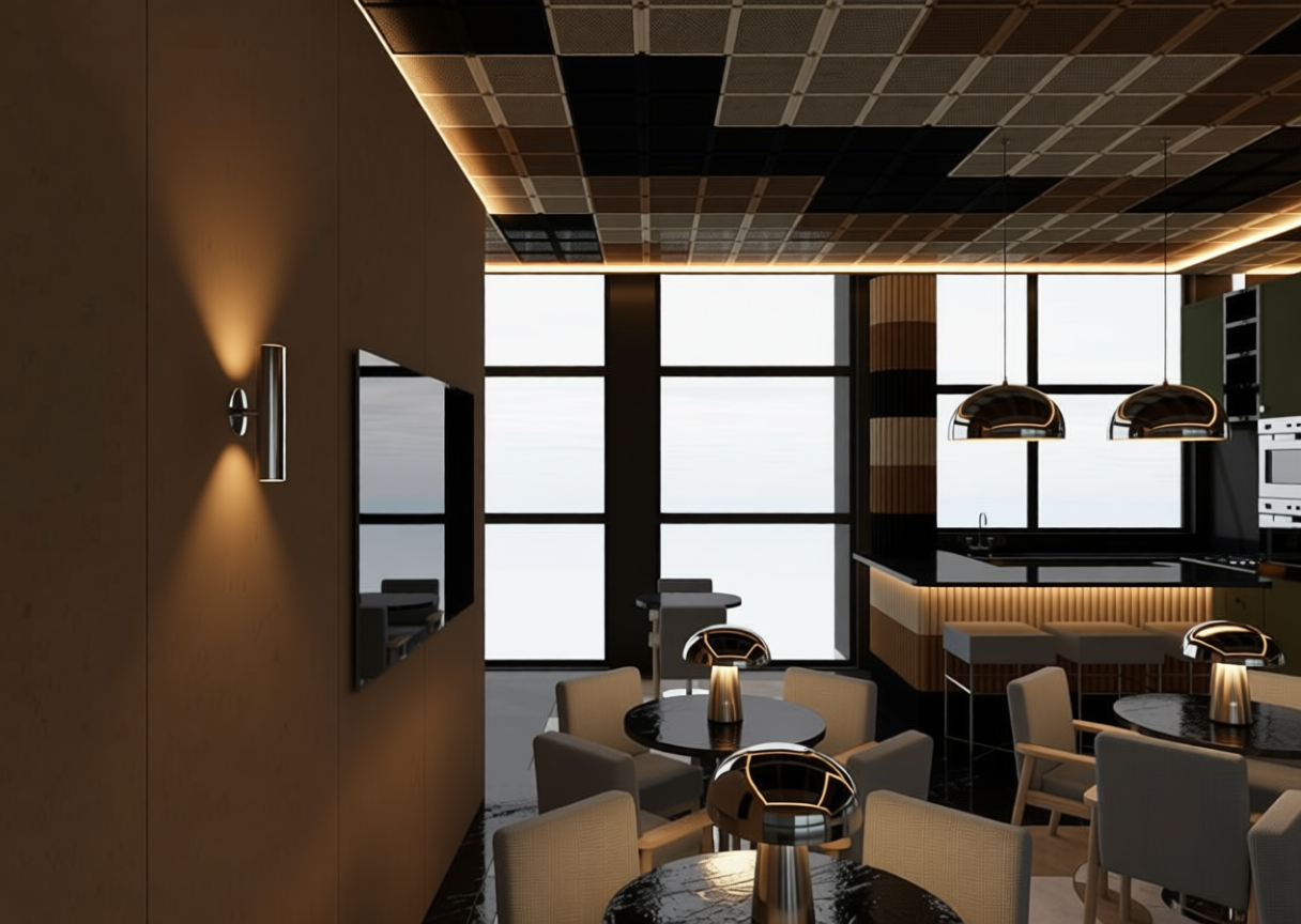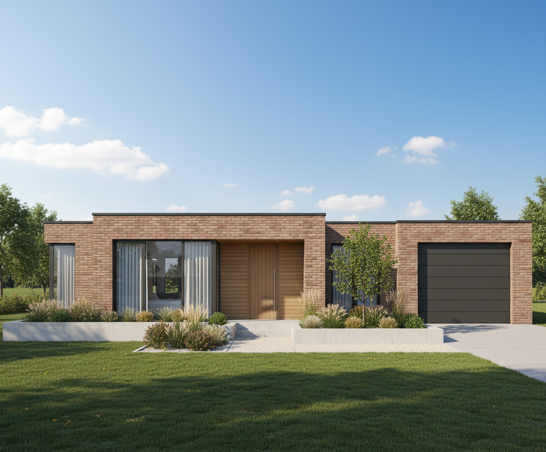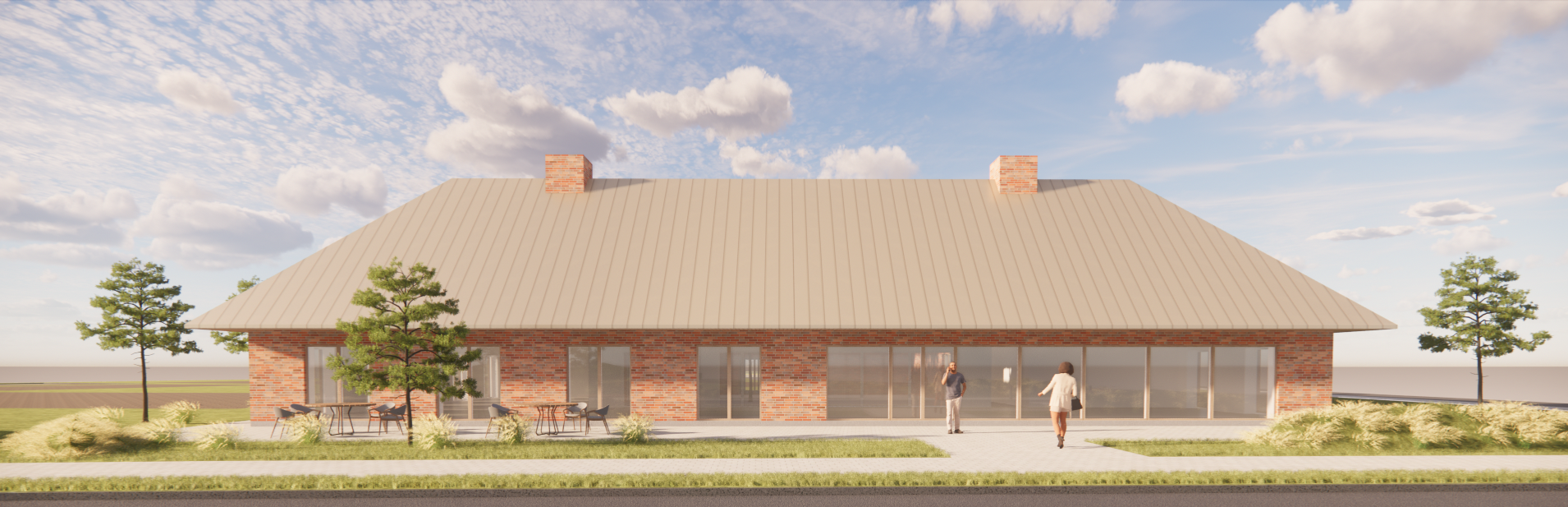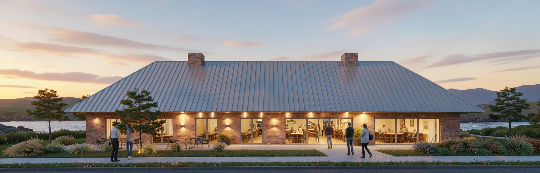 use the provided enscape render as base reference keep exact layout proportions and camera angle keep materials and facade disposition make it a japanese scandinavian restaurant with and arrival area with vegetation from the danish west coast add flat danish west coast landscape in background no water make it a late summer evening add lighting on facade add a few anatomically correct people