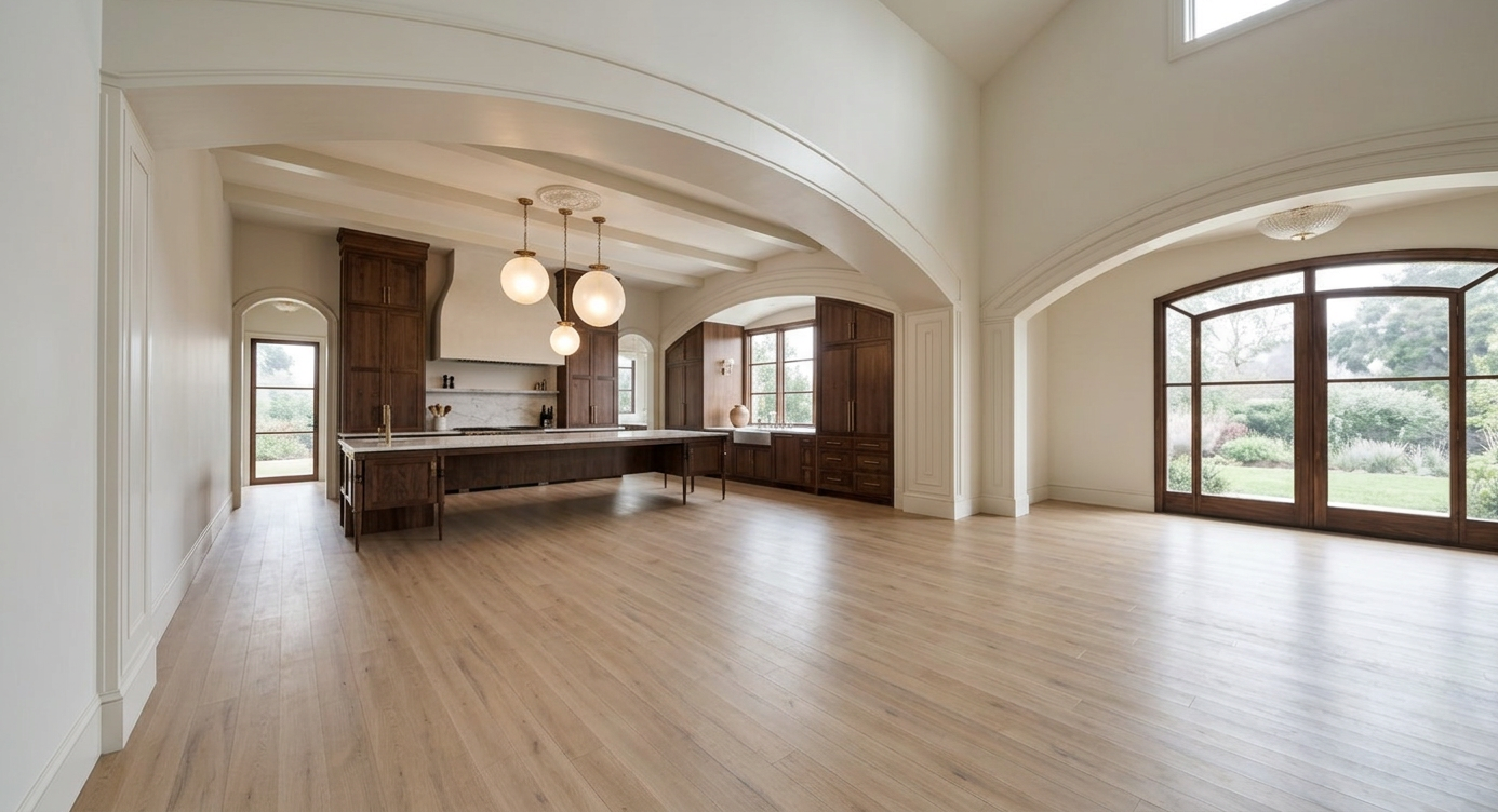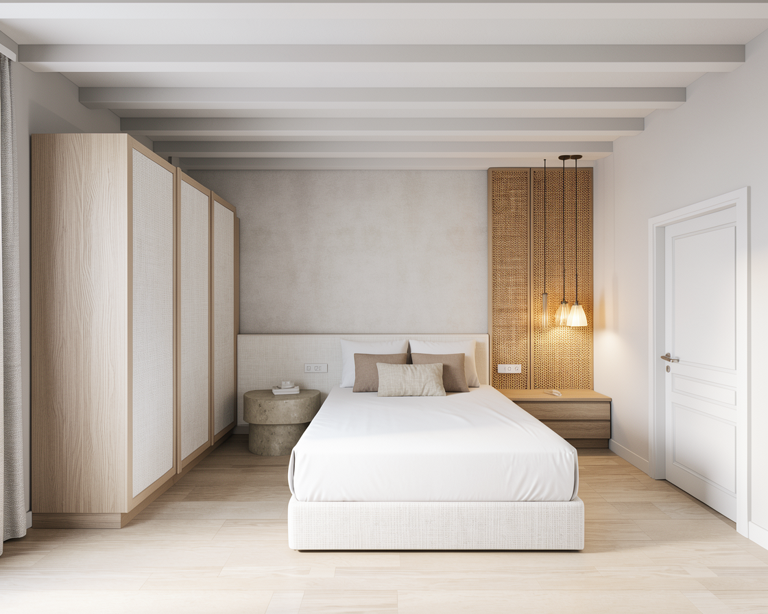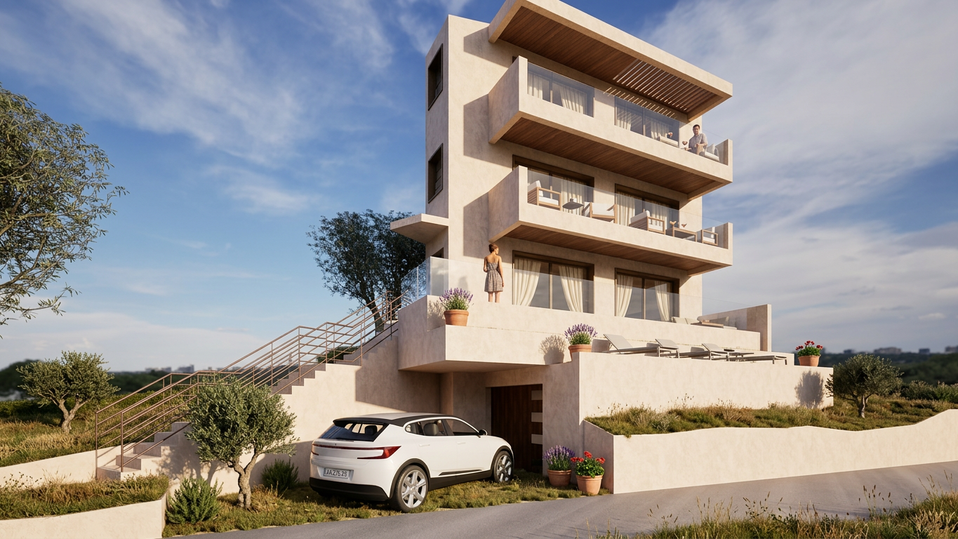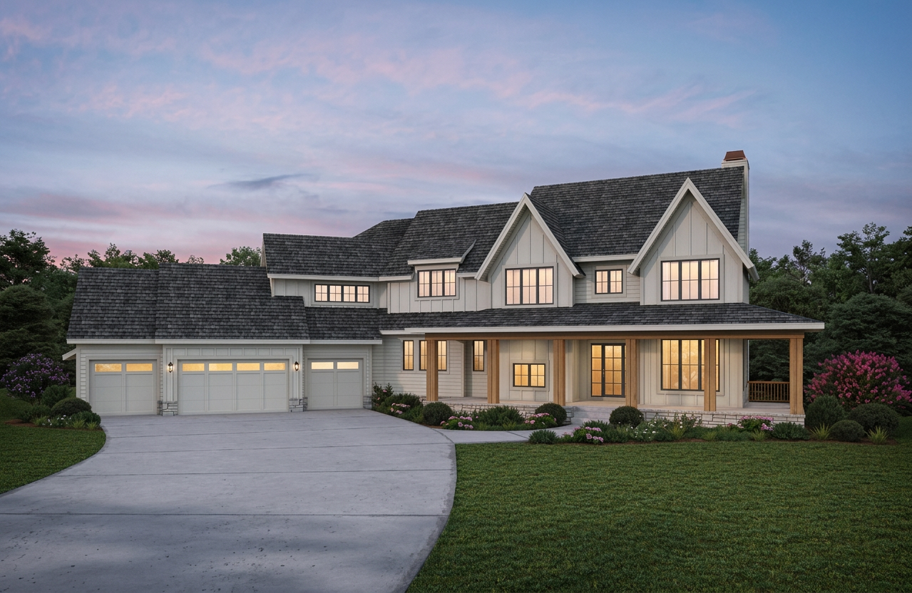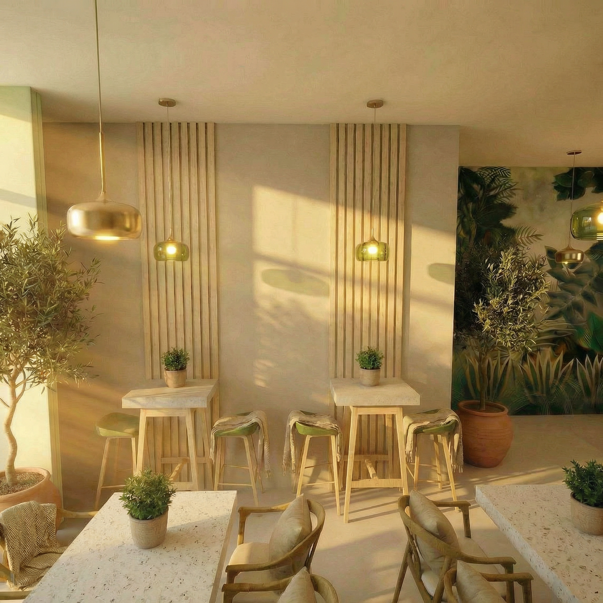 use the provided enscape render as base reference keep exact layout proportions and camera angle keep materials and facade disposition make it a japanese scandinavian restaurant with and arrival area with vegetation from the danish west coast add flat danish west coast landscape in background no water make it a late summer evening add lighting on facade add a few anatomically correct people
