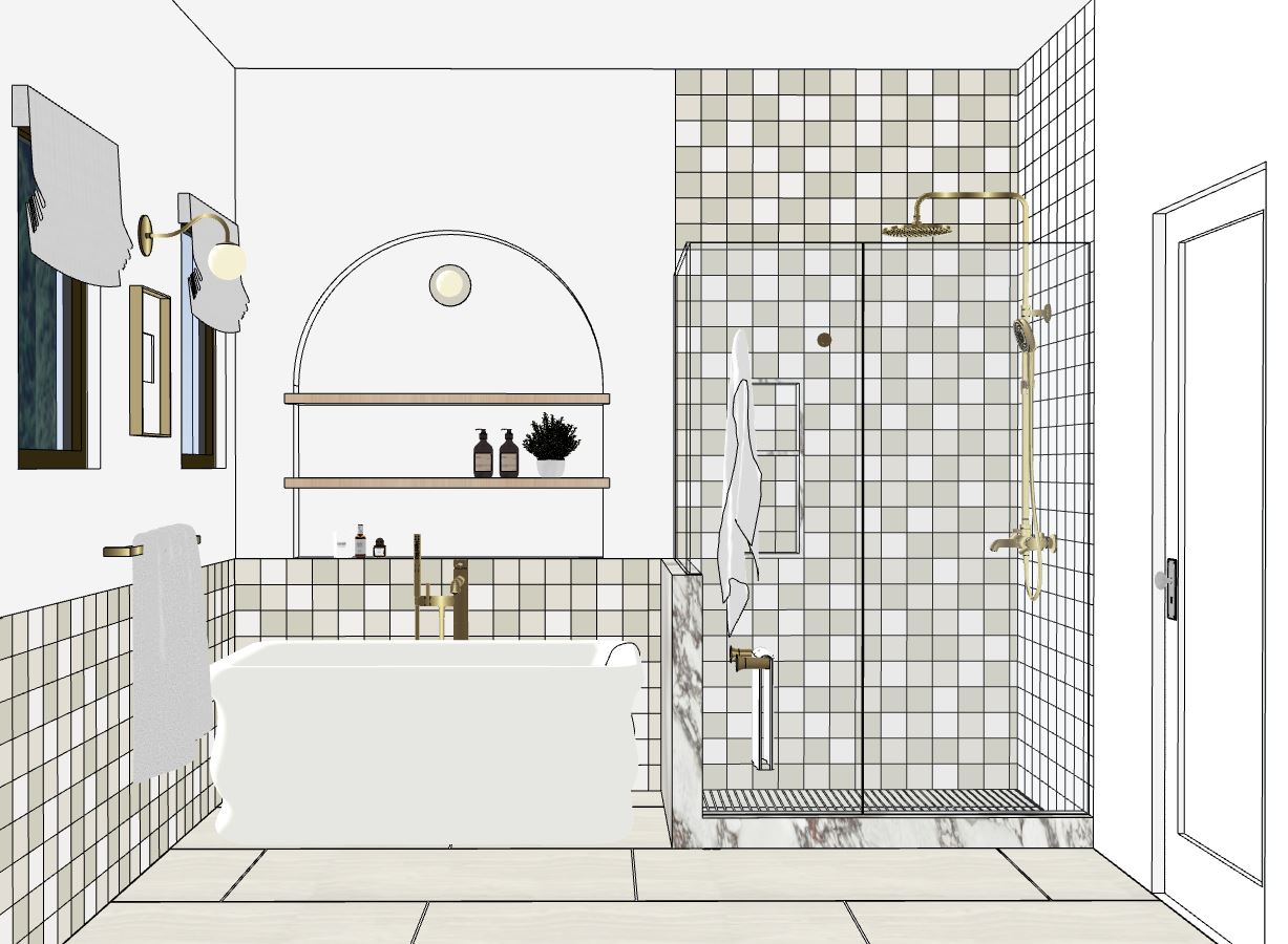 create a photorealistic rendering of this bathroom with soft warm indirect lighting
