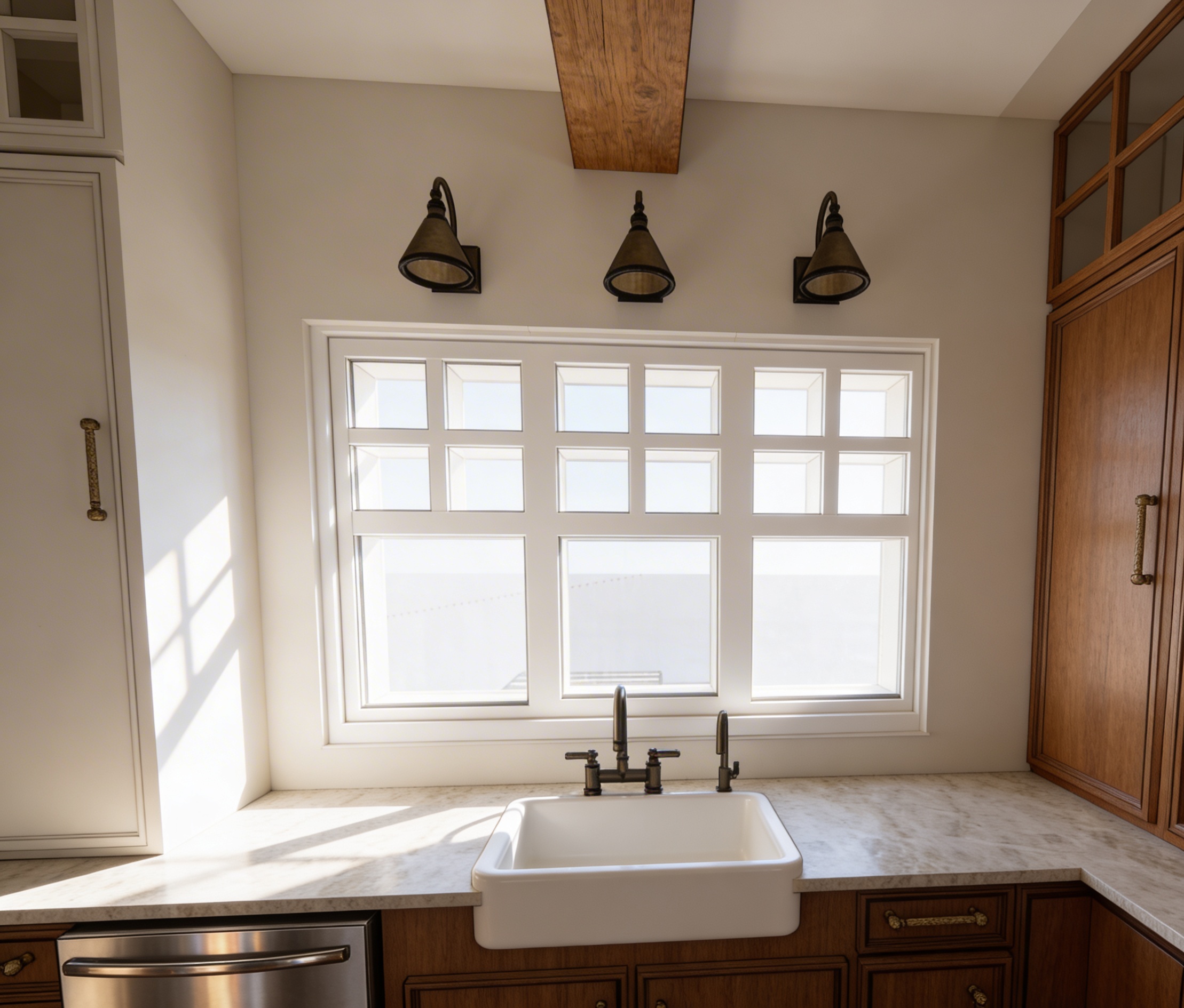 this is a contemporary bedroom that exudes warmth and feels luxurious and expensive the headboard is upholstered in premium linen beige sand fabric and extends all the way to the ceiling creating a strong vertical statement and an elegant focal point on the right side of the elevation there is a full height bronze color clear mirror in the left there is a light champagne oak wood panel adding warmth and contrast the bed is dressed with perfectly ironed impeccably arranged bedding and pillows styled like a five star hotel the sheets and duvet are crisp smooth and wrinkle free two back pillows are in an off white beige tone while the front decorative pillow features a darker beige taupe fabric adding depth and layering the bedside tables are finished in champagne oak tone matching the wood paneling the top surface is white marble with subtle natural beige veining on top of each bedside table there are two table lamps as shown in the photo the lampshade features a beige linen fabric the overall atmosphere is refined warm contemporary luxury with balanced natural light and soft ambient lighting
