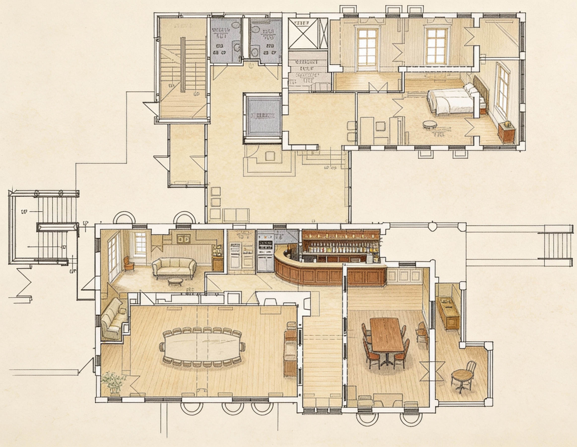 small spa floor plan on a historic hotel campus illustrated in plan view clean minimal and diagrammatic with soft hand drawn line quality and subtle sketch texture clearly distinguish treatment rooms relaxation areas locker rooms reception circulation and any water features with restrained line weights and hierarchy calm muted warm color palette emphasizing soft neutrals gentle greens light wood tones and tranquil accents professional quiet competition ready and visually legible evoking a luxurious serene spa environment while maintaining historic context without photorealism or perspective distortion remove all annotations and labels