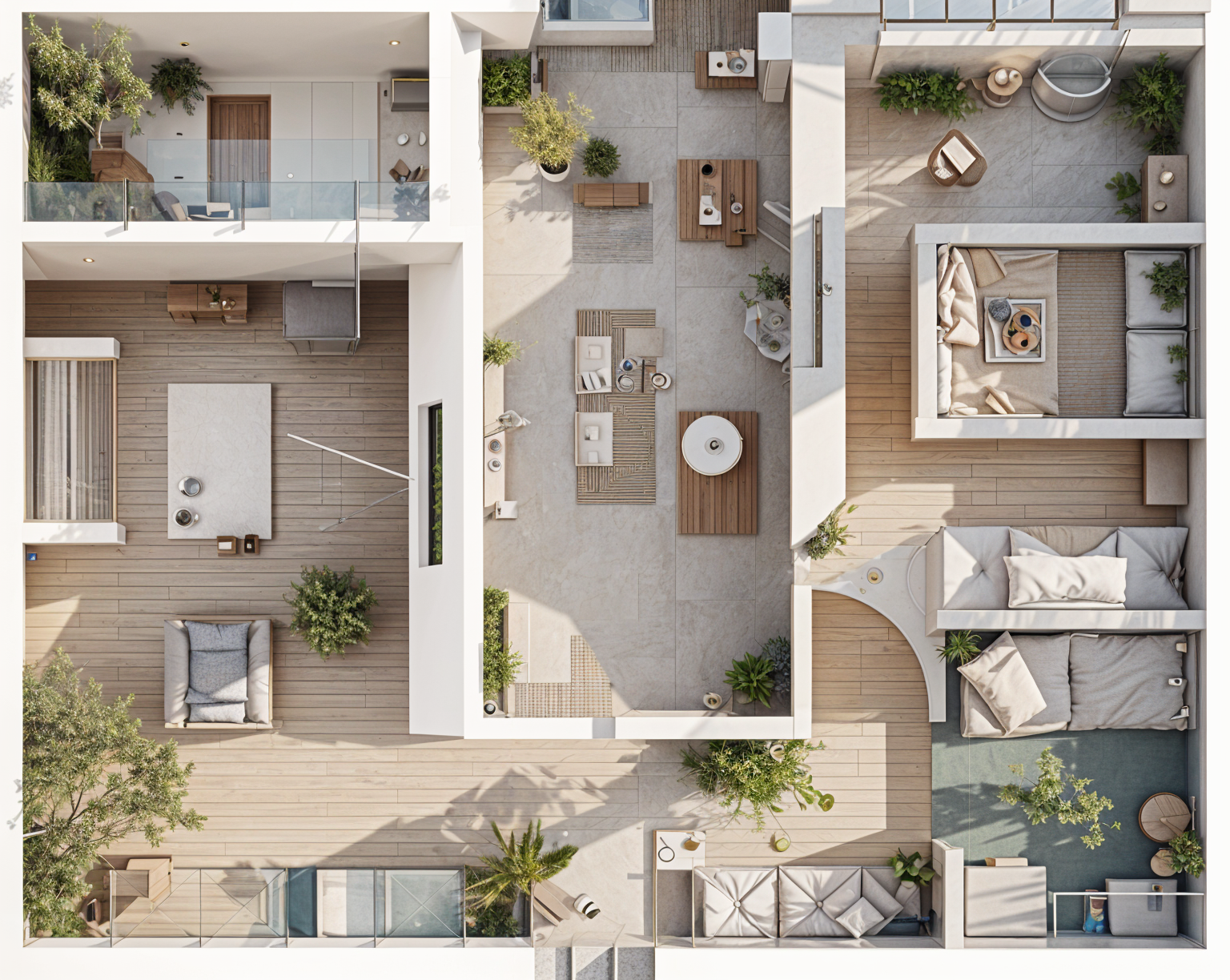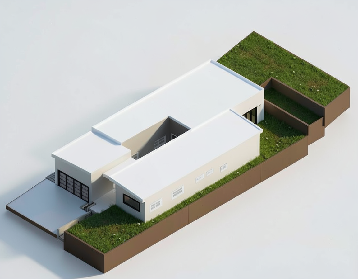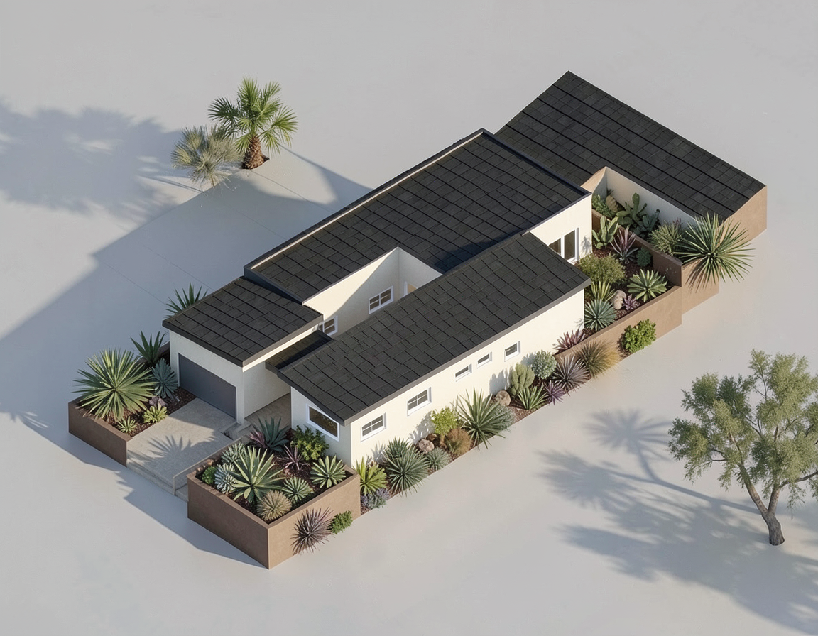 photorealistic architectural visualization 8k resolution highly detailed material textures ray traced reflections on glass surfaces soft ambient occlusion shadows environment cinematic natural lighting crisp afternoon sun realistic sky with subtle cirrus clouds landscaping high fidelity lush greenery multi layered ornamental grasses and professional xeriscaping sharp leaf textures technical shot on 35mm lens f 8 sharp focus clean lines no distortion professional color grading