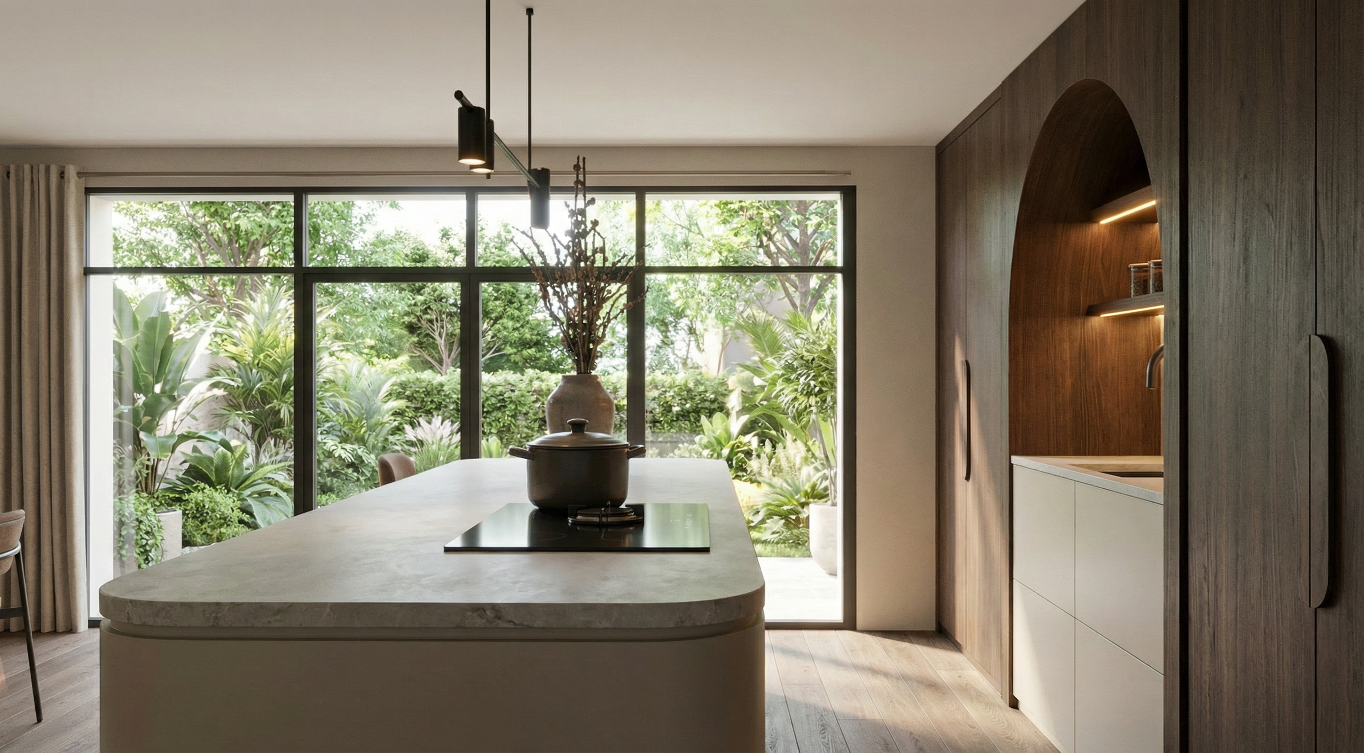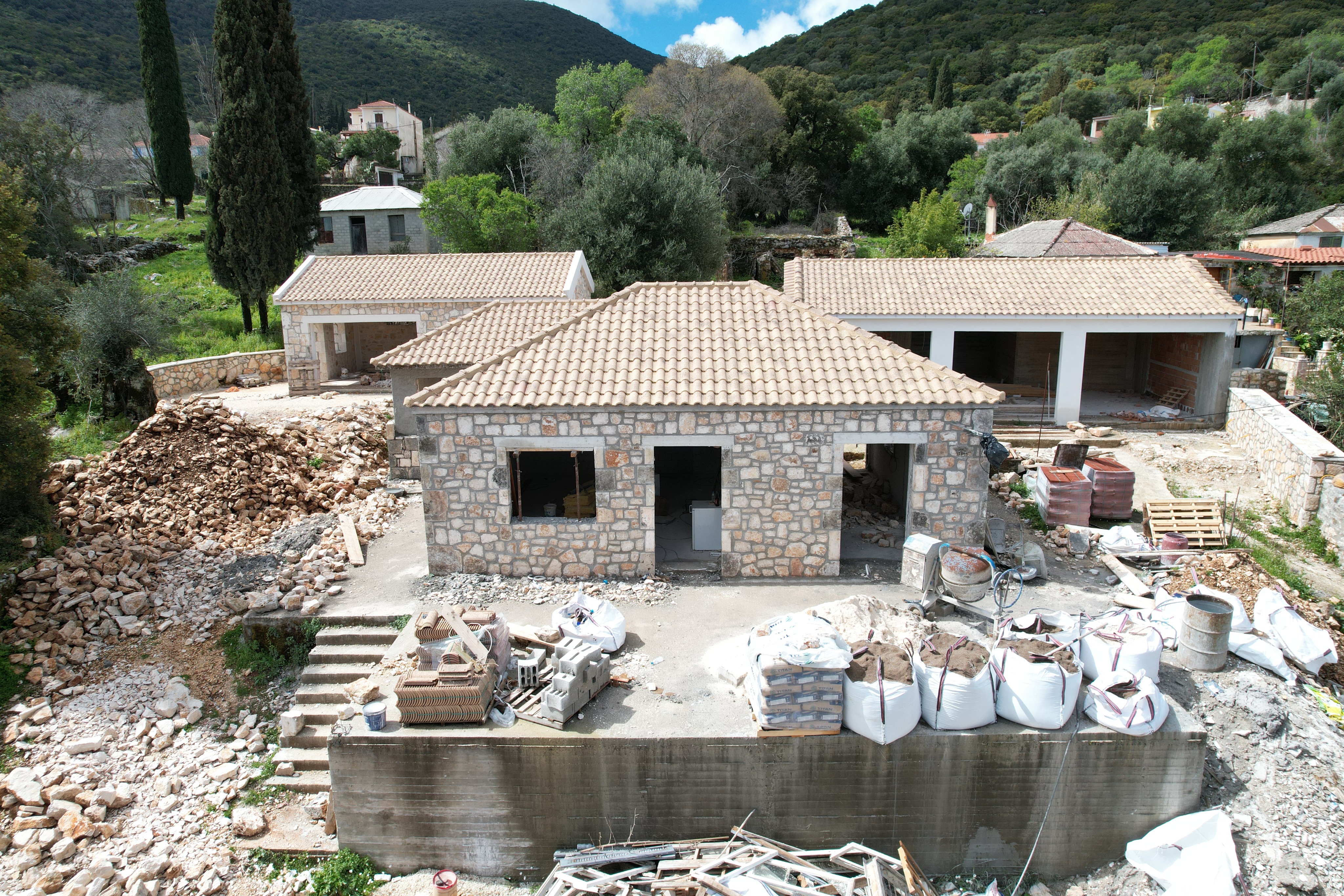 hese are three stone houses that are planned for construction i would like you after carefully observing the exact form of the buildings to create beautiful courtyards add windows where needed and include lighting both on the buildings and around them also design attractive surrounding landscaping and pathways that connect the houses incorporating lighting as well please avoid adding flowers use grass and paving wherever you see concrete i would like a beautiful photorealistic visualization of the final project you can draw inspiration from platforms like pinterest focusing on elegant summer residences