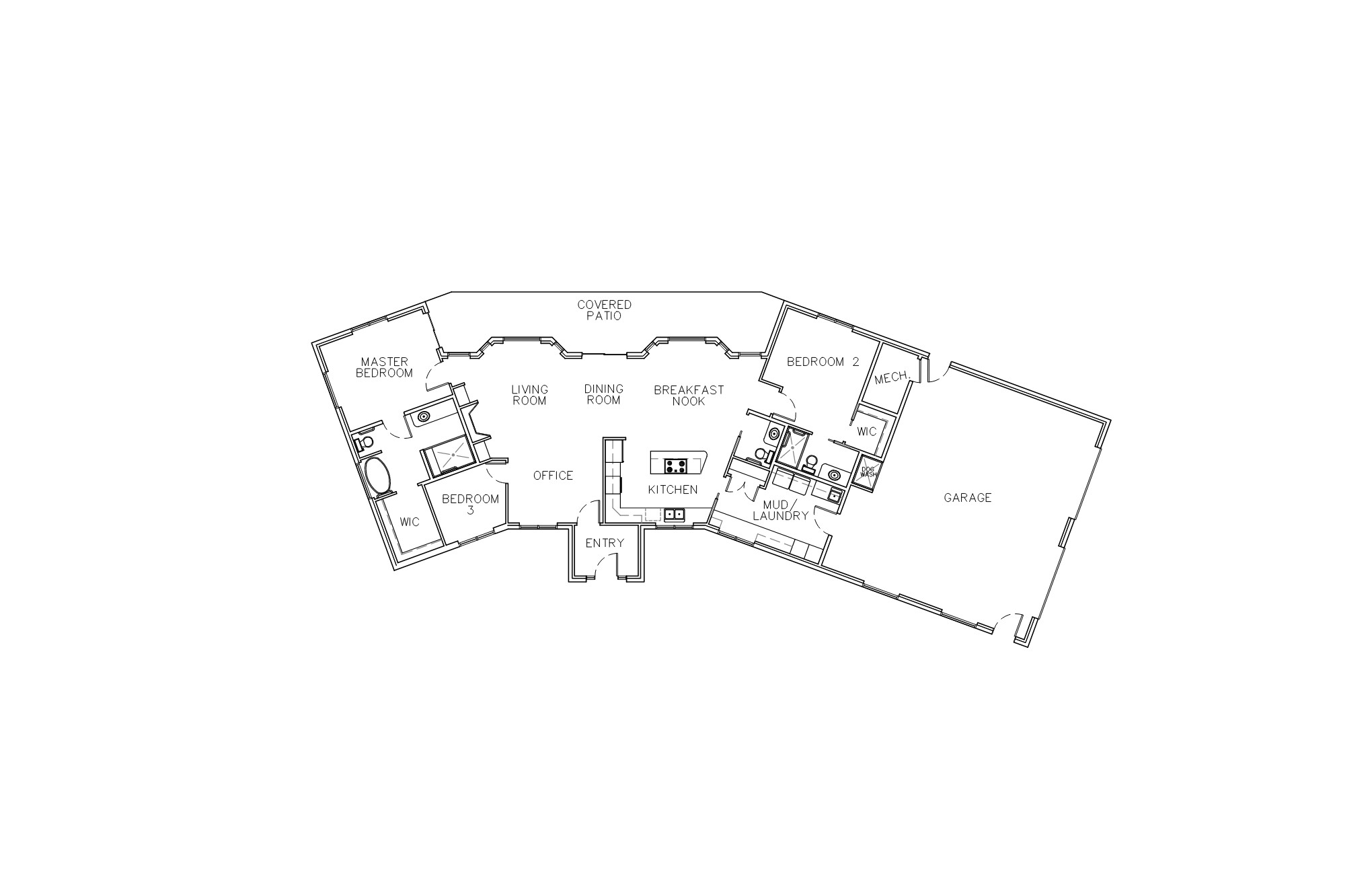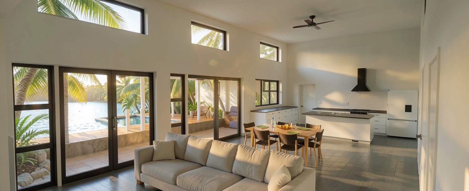 convert this floor plan into a realistic isometric 3d view of a full house show the space from an elevated angle with furniture walls and details visible create a beautifully rendered floor plan of a modern house use a soft beige color for the walls pale oak for the flooring and warm white for the ceilings highlight the kitchen with light gray countertops and stainless steel appliances add comfortable furniture in the living room with earth toned sofas and a rustic wooden coffee table the bedrooms should have deep blue feature walls for a cozy atmosphere with plush carpets in light gray include green indoor plants for a touch of nature scattered throughout create a bright airy atmosphere with natural sunlight streaming in casting soft shadows maintain all walls doors and windows shown in the original plan do not change any wall locations use the same furniture as shows on the plan do not change the orientation of the floorplan