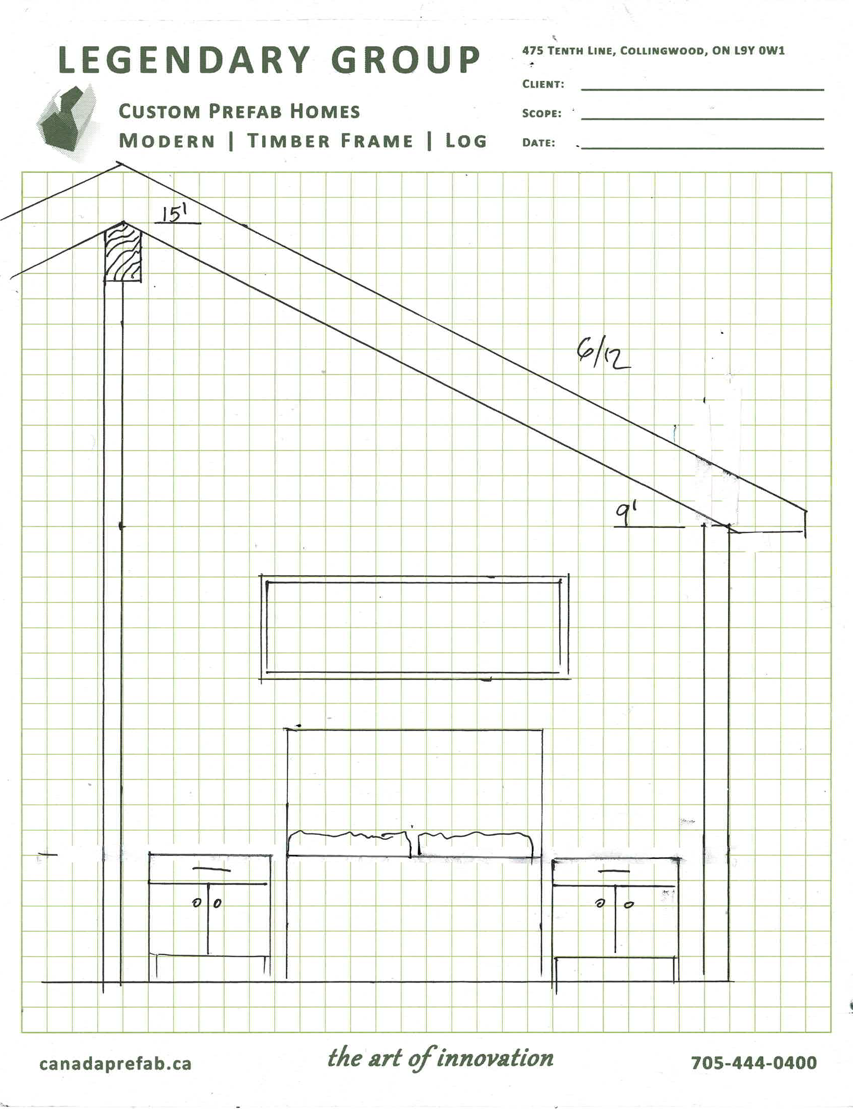 create a 3d image of this bedroom sections drawing use a weathered brownish color for ceiling and ridge beam and other colors for bed and wall colors use the section in the sketch the roof starts at 9 and rises on a 6 12 pitch to 15 the wall is directly below the ridge beam