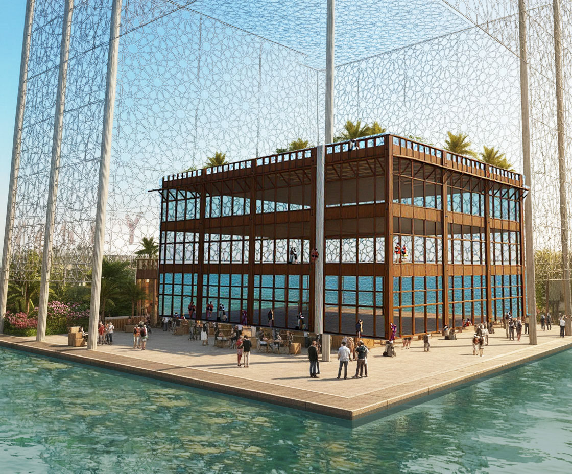 keep everything exactly as it is in the input image preserving the original morphology scale and volumetry inside the wooden building show a lot of activity on the ground floor there are restaurants with warm golden lights and people dining on the first and second floors there is a more elegant and intimate vip area with a warm and refined atmosphere add a glass handrail between the platform and the water all other elements must remain unchanged